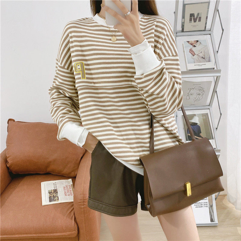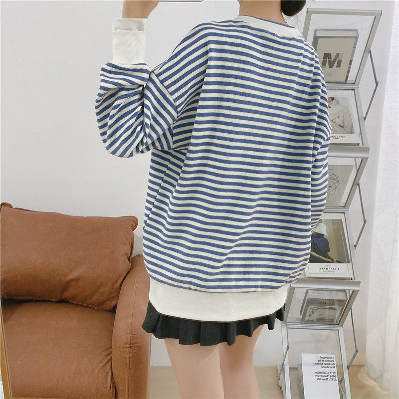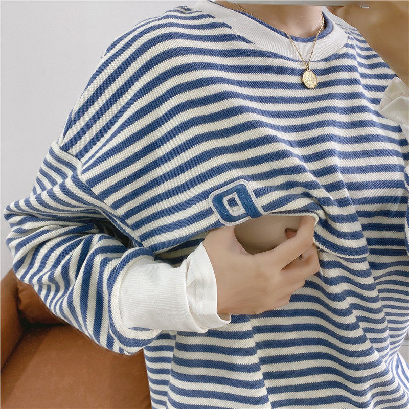 Lactation striped casual blouses pure cotton long sleeve postpartum round neckline jacket head jacket loose casual jacket horizontal open pull chain