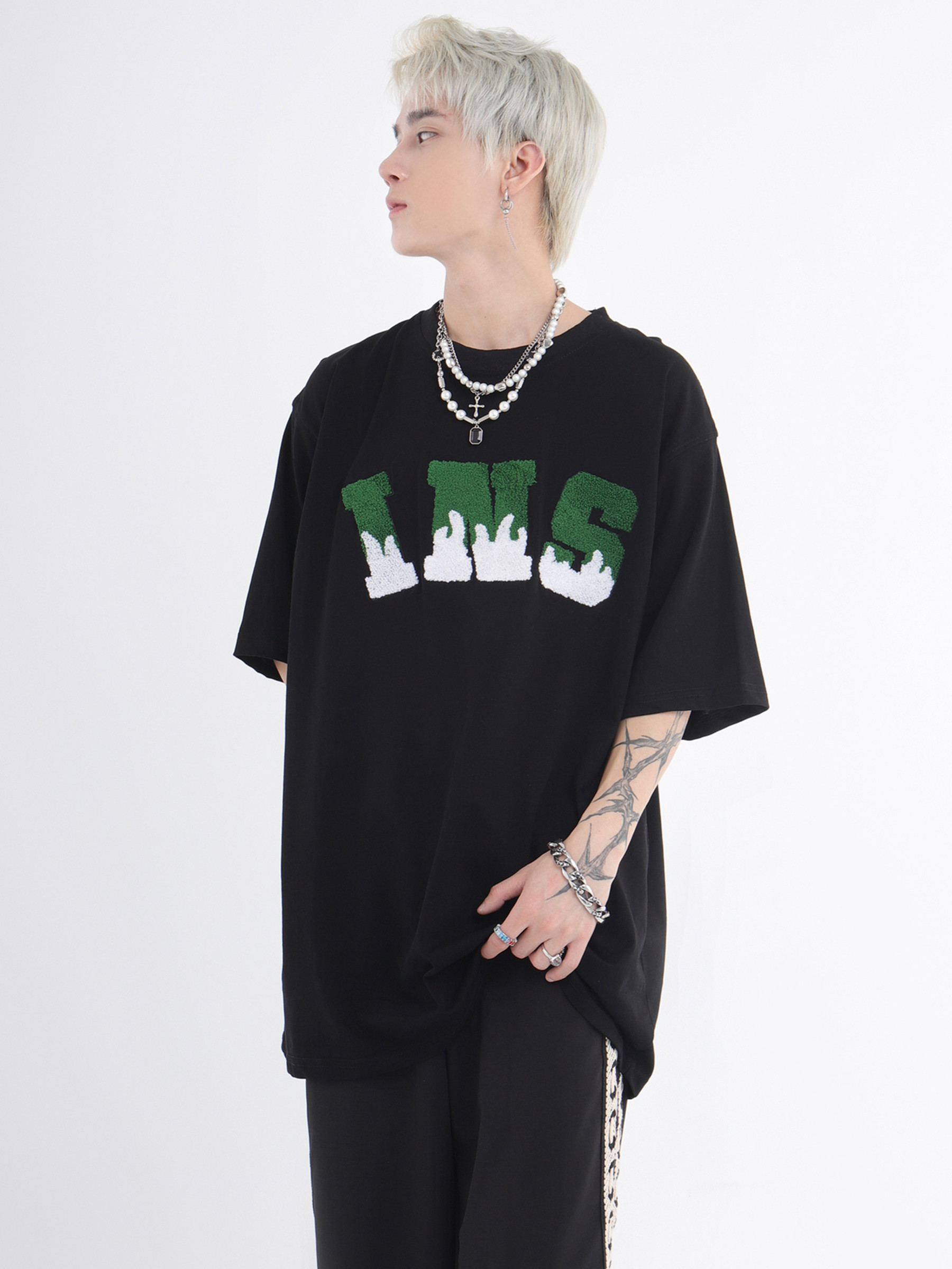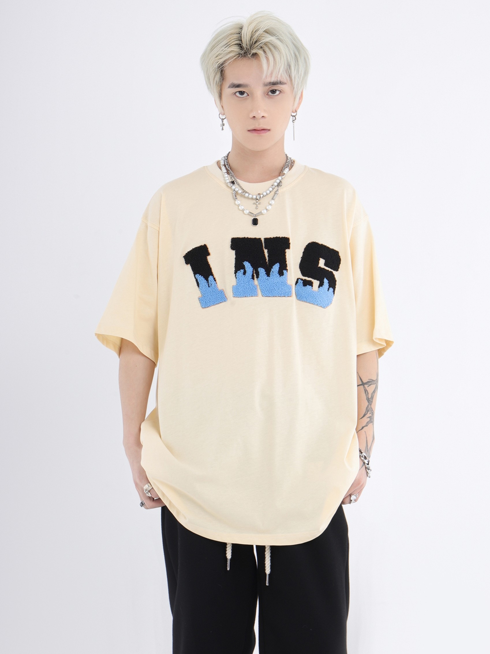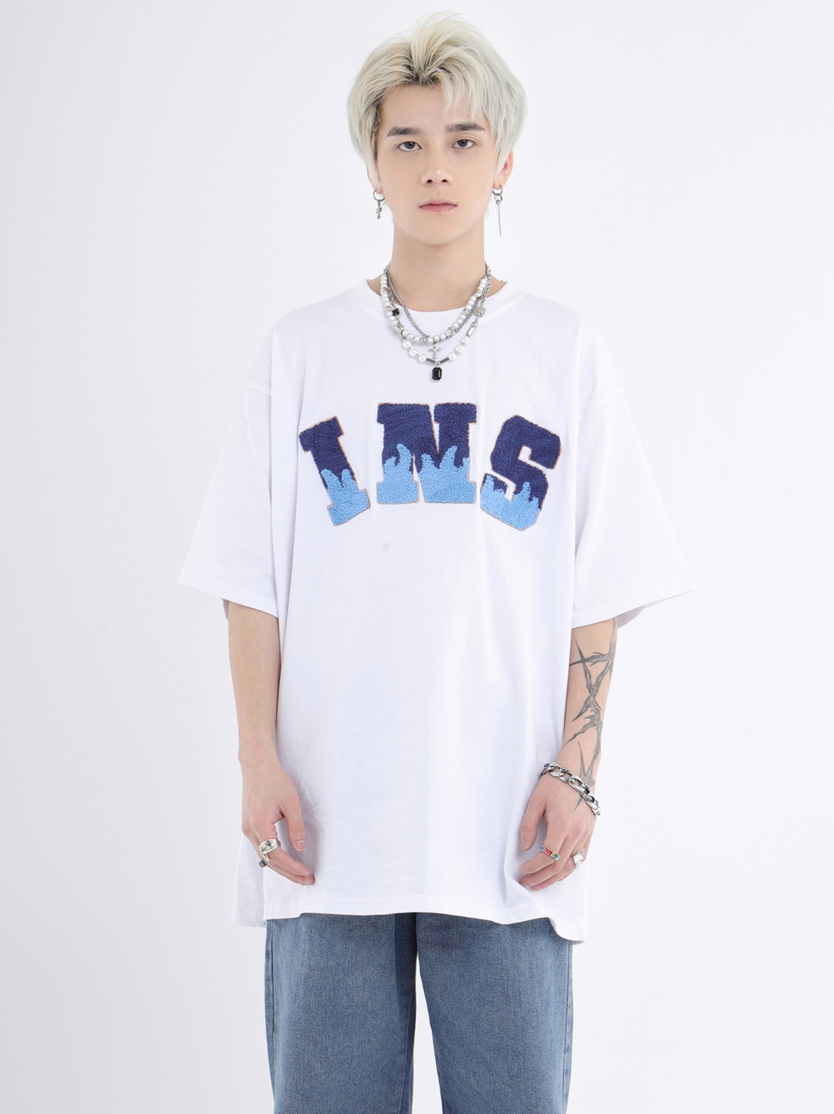 INSstudios Flocking Flame Short Sleeve Homemade National Tide Lovers Summer Towel Embroidered LOGO Pure Cotton T-shirt Male and female