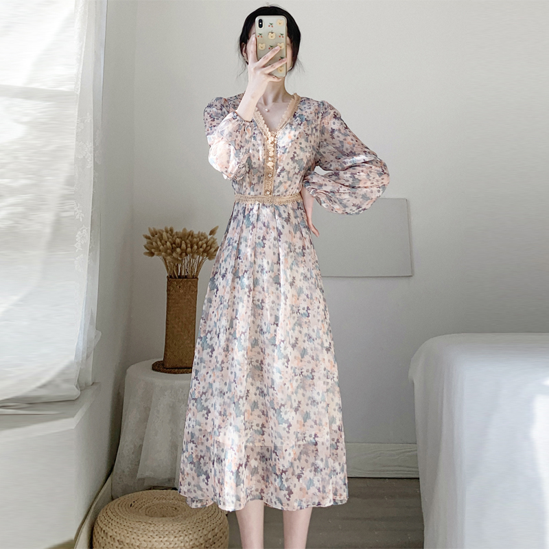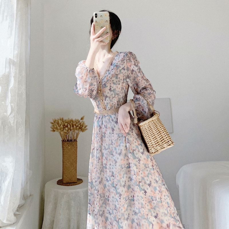 High-end lace stitching floral dress women's spring and autumn 2022 new waist-length chiffon over-the-knee dress