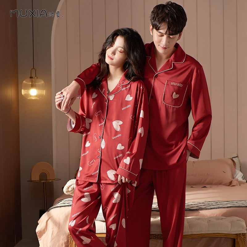 2022 New lovers sleepwear spring and summer thin section long sleeve ice silk one man and one woman married red home suit suit