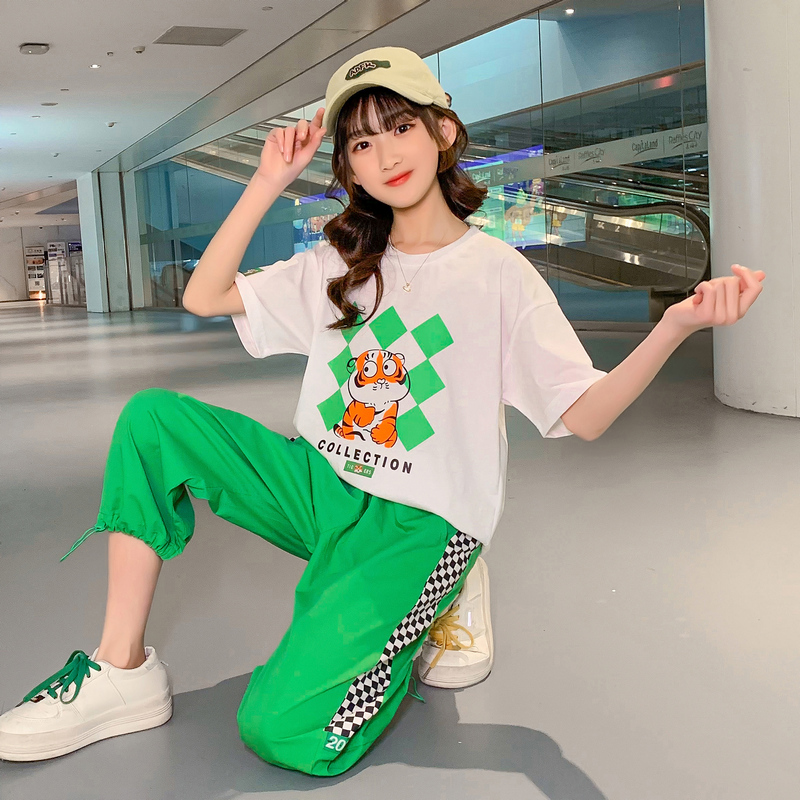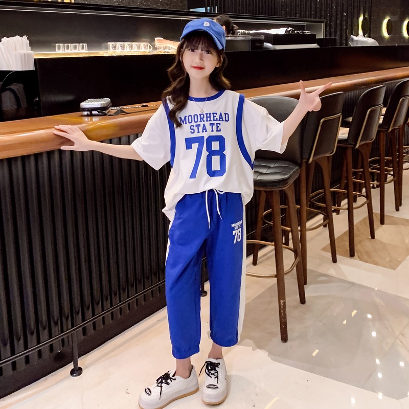 Girl Summer Dress Trendy Children Suit Short Sleeve Big Boy Nets Red 2022 New Foreign Pie Girl Clothes Summer Two Sets