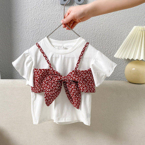 Girls short-sleeved T-shirt summer 2022 new bow fake two-piece suspender top female baby summer Korean version of the tide