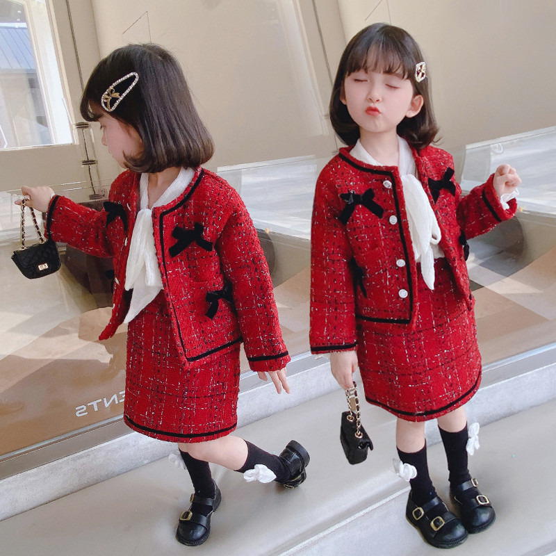 OKAIDI French girl 2022 spring and autumn small fragrant wind suit Children's Korean version Korean version Long sleeve dress Two sets