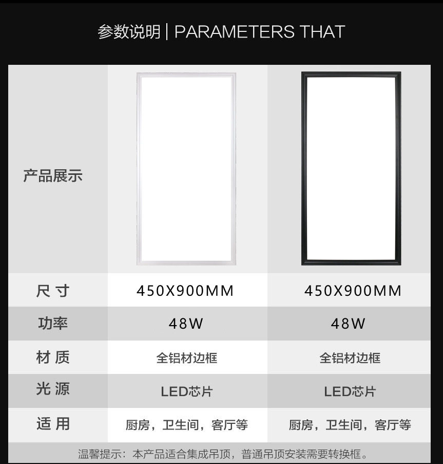 Default white light If three-color frame is required, please contact customer service 450*450 LED light White paint frame 450*900 LED light Black paint frame 45