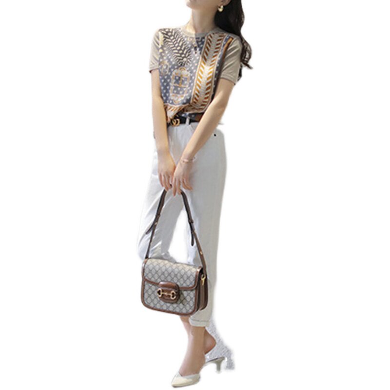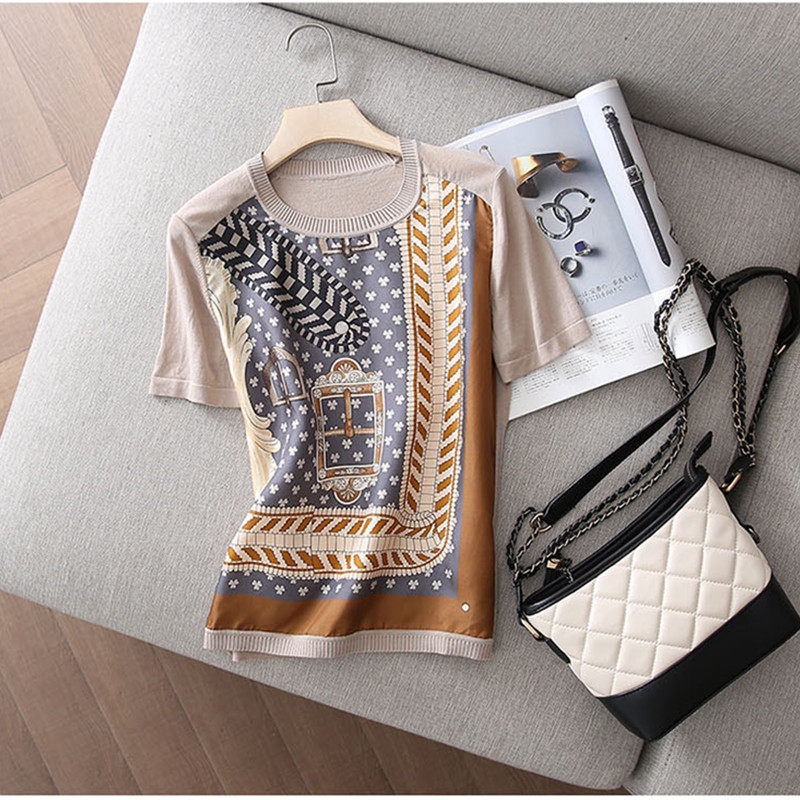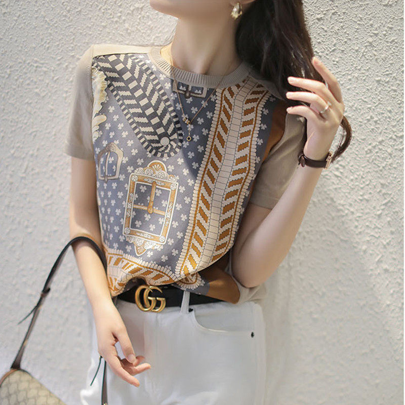 Longzi short-sleeved t-shirt women's 2022 new summer loose round neck half-sleeved silk stitching ice silk knitted top