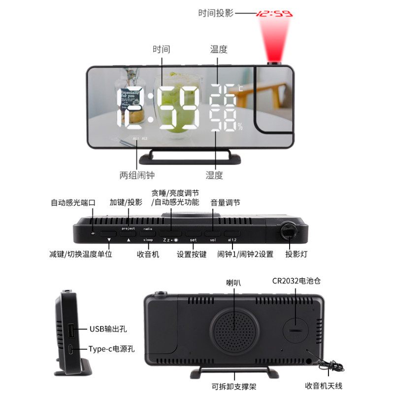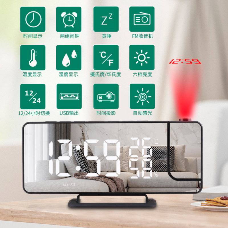 Mirror temperature and humidity radio projection clockMirror projection clock-basic model with vibration silent projection alarm clock surface three-color display radio projection alarm clock temperature and humidity projection alarm clock with weather display and second display projection