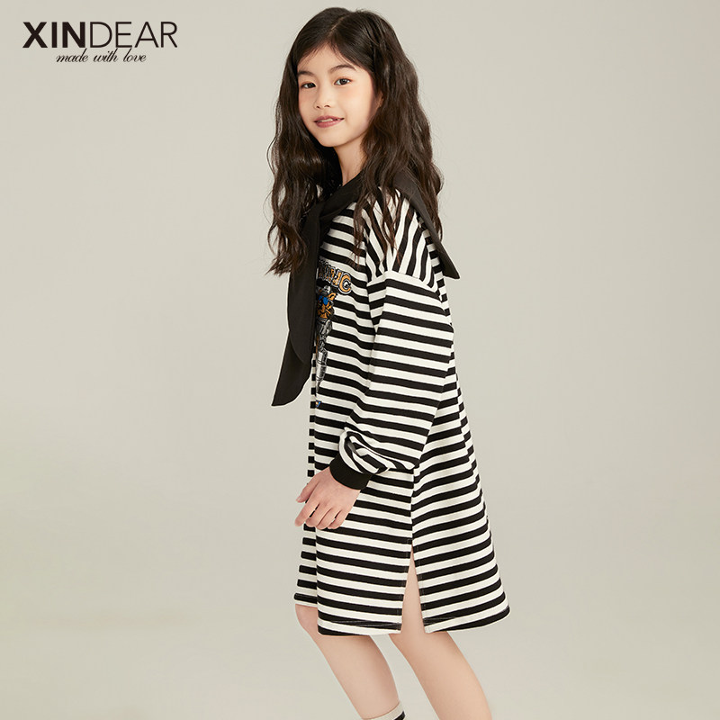 Girl Cotton Striped Dress Spring 2022 New Children's Korean Version Cartoon Black & White Dress Medium Long Version Long Sleeves