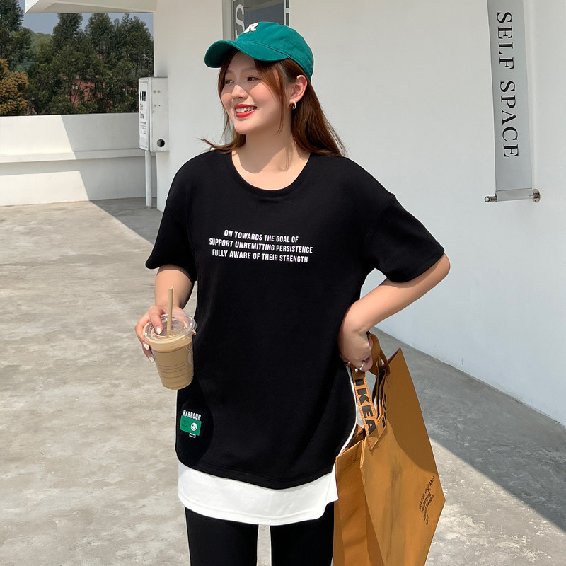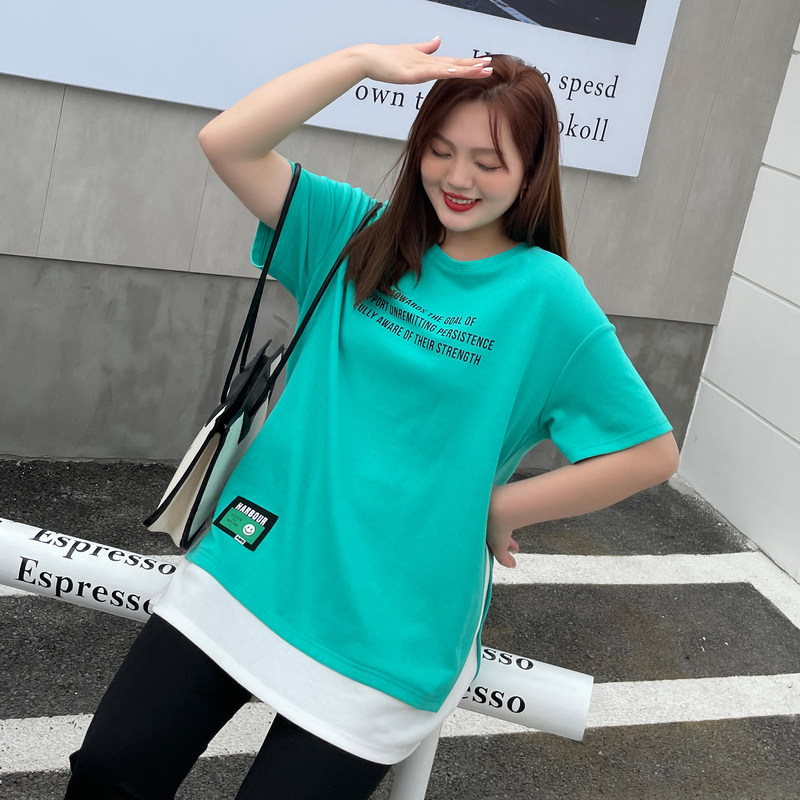 Cilie Show 2022 Summer dress New Fat mm Fashion Less age Large size Dress Personality Splicing Fake two short sleeve T-shirts