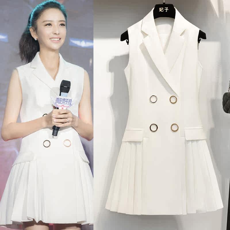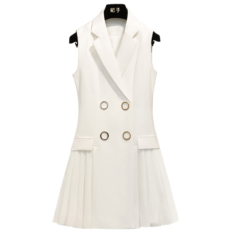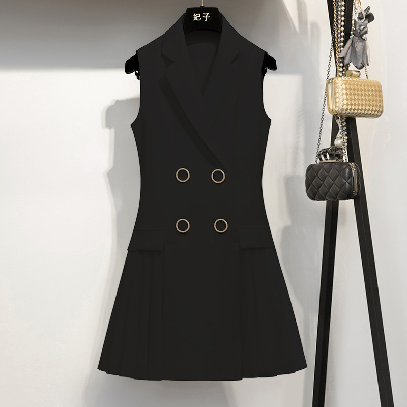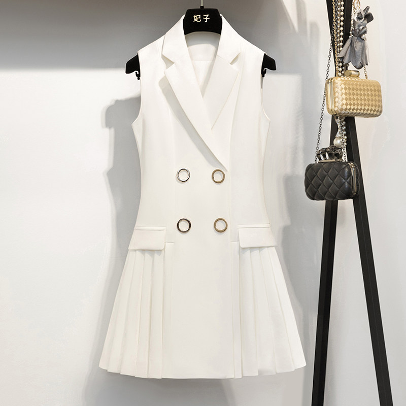 French dress women's 2022 summer new ladies show thin temperament mid-length suit collar waist pleated skirt
