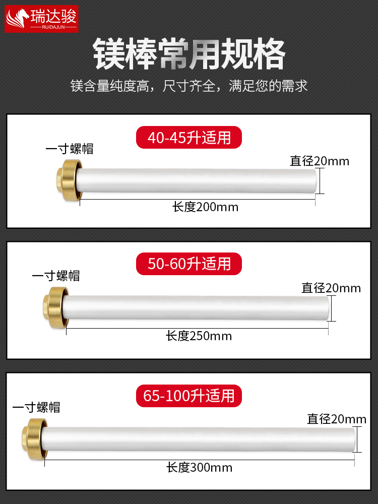 Length 20cm magnesium rod + copper nut (40-45L exclusive) Length 25cm magnesium rod + copper nut (50-60L exclusive) Length 30cm magnesium rod + copper nut (65-80L exclusive) Length 20cm magnesium rod Length 25cm magnesium rod Length 30cm magnesium rod Older special length 18cm + 5 minutes nut Other 6 minutes + 20cm magnesium rod