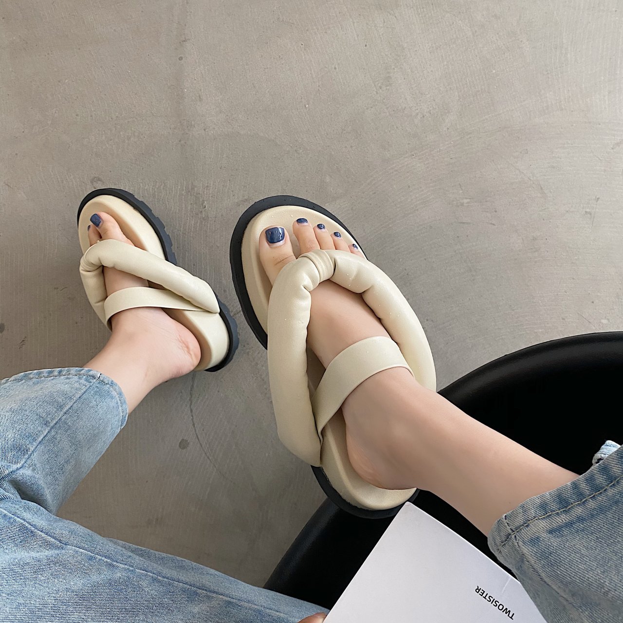Wear red pine thick human slippers outside the summer of 2023 new summer toe bread beach shoes