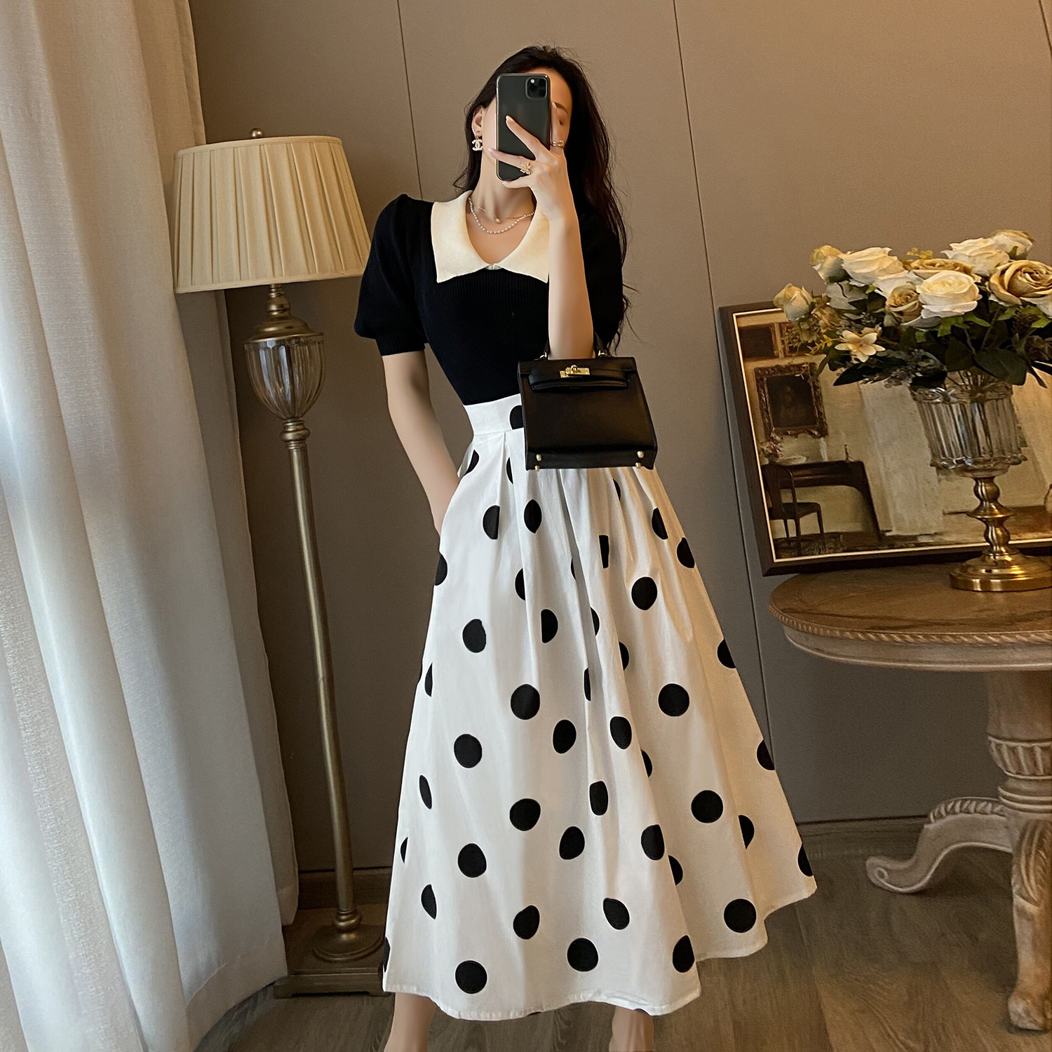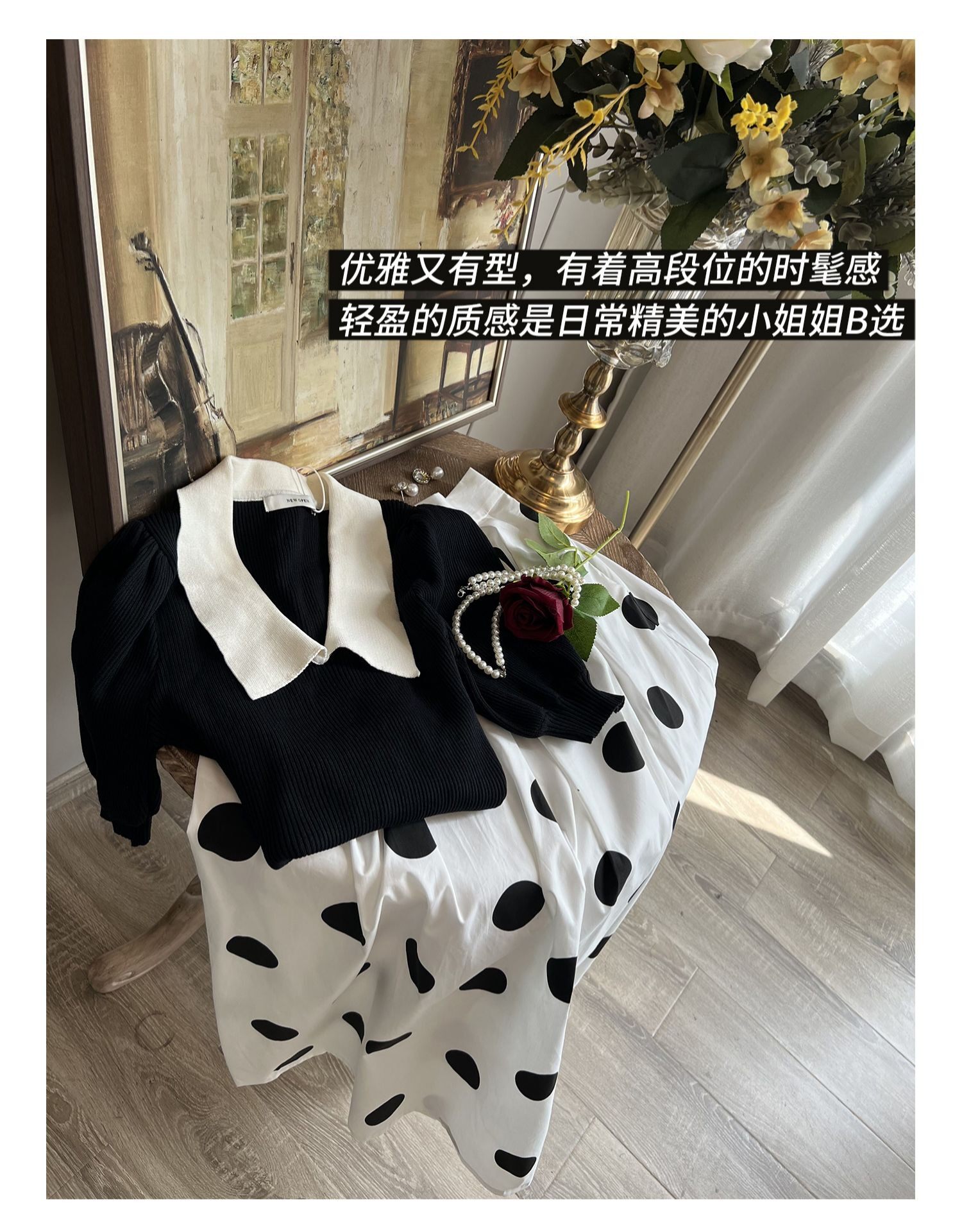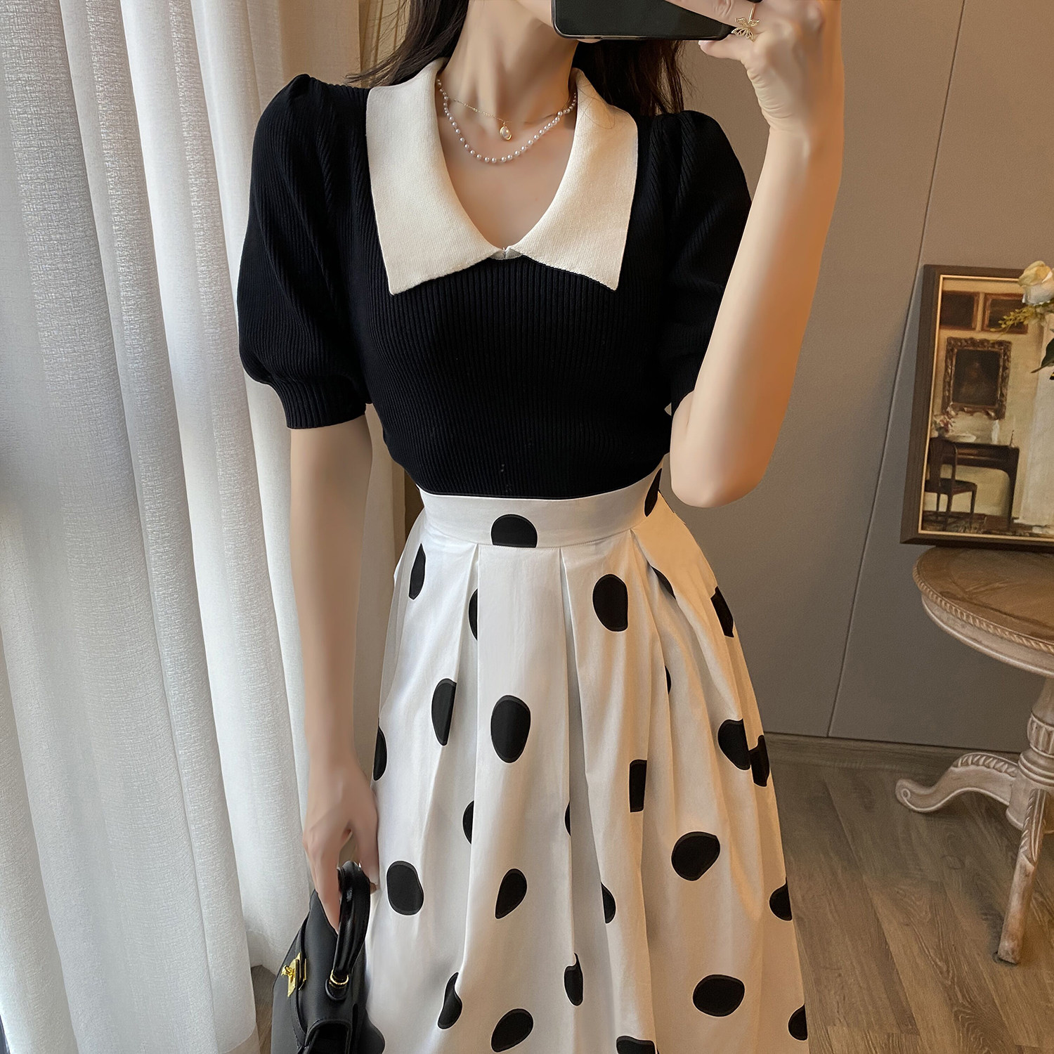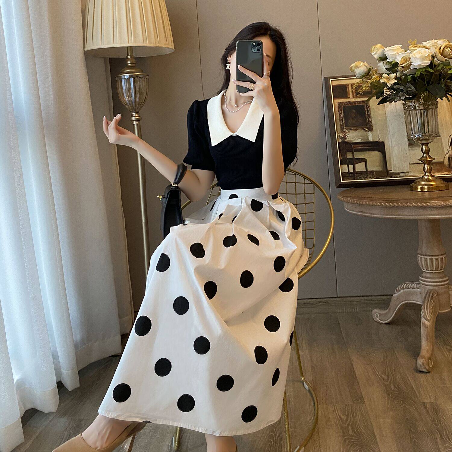 Black top + polka dot skirt (two-piece set)