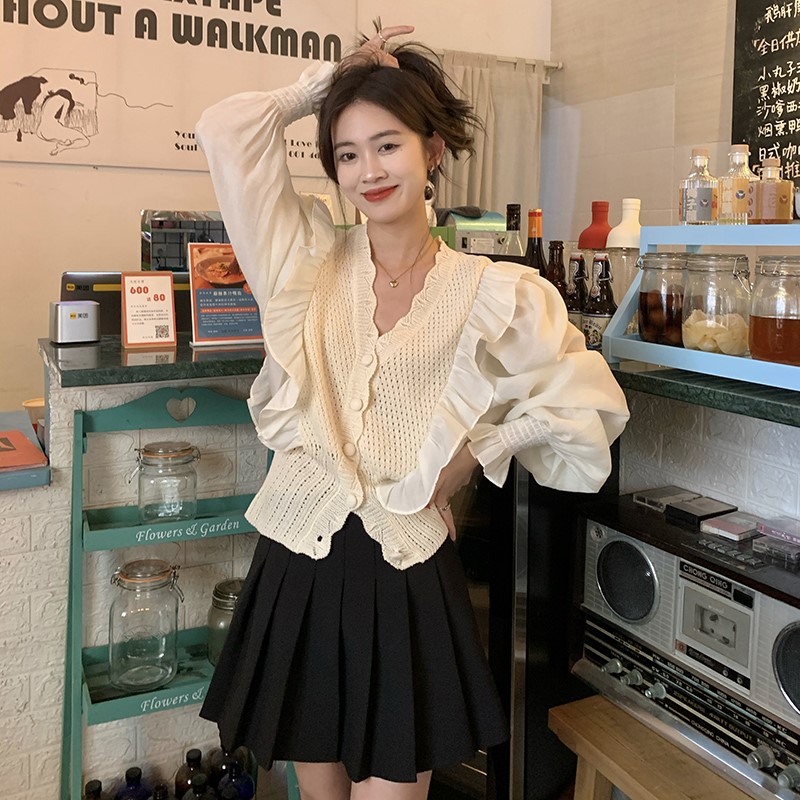 Lotus leaf side spring - up V collar shirt spring - dress 2022 new French gas design to feel waist long sleeve tops women