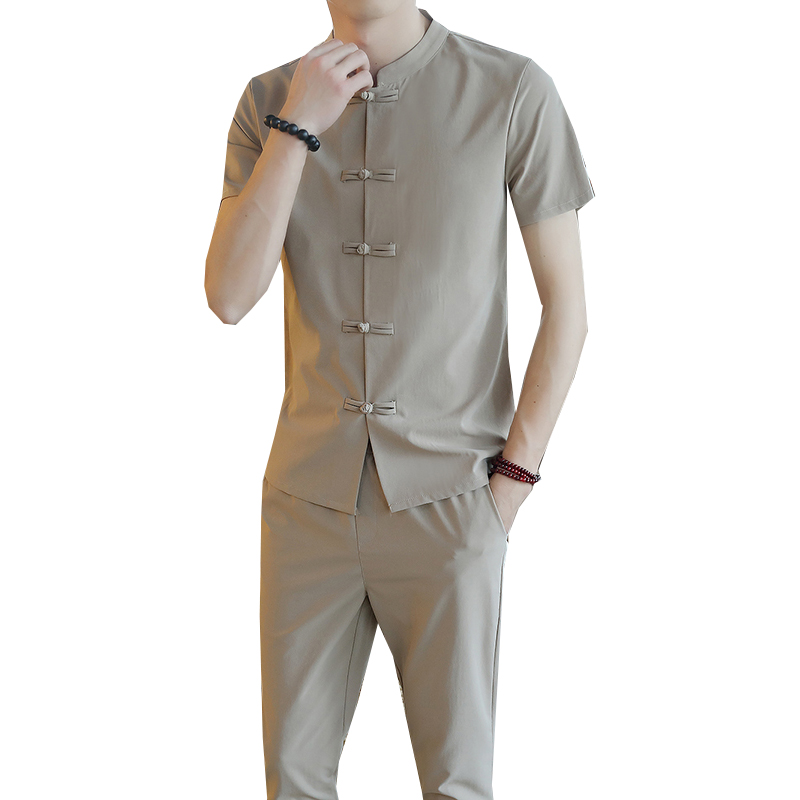 Summer imitation cotton linen China Wind disc buckle Down with male short sleeve shirt long pants casual suit Youth Han uniforms Gutshio-Taobao