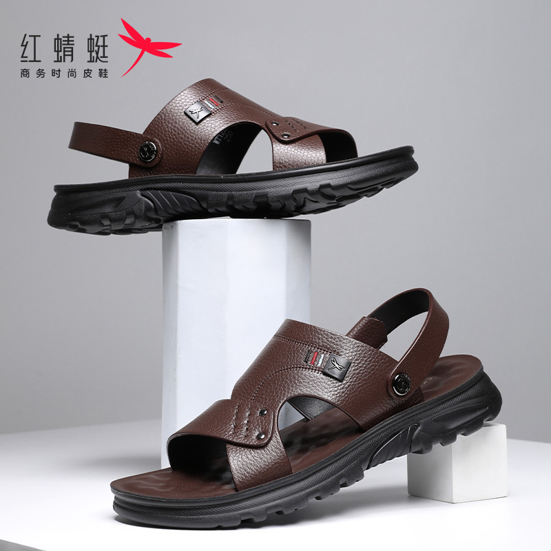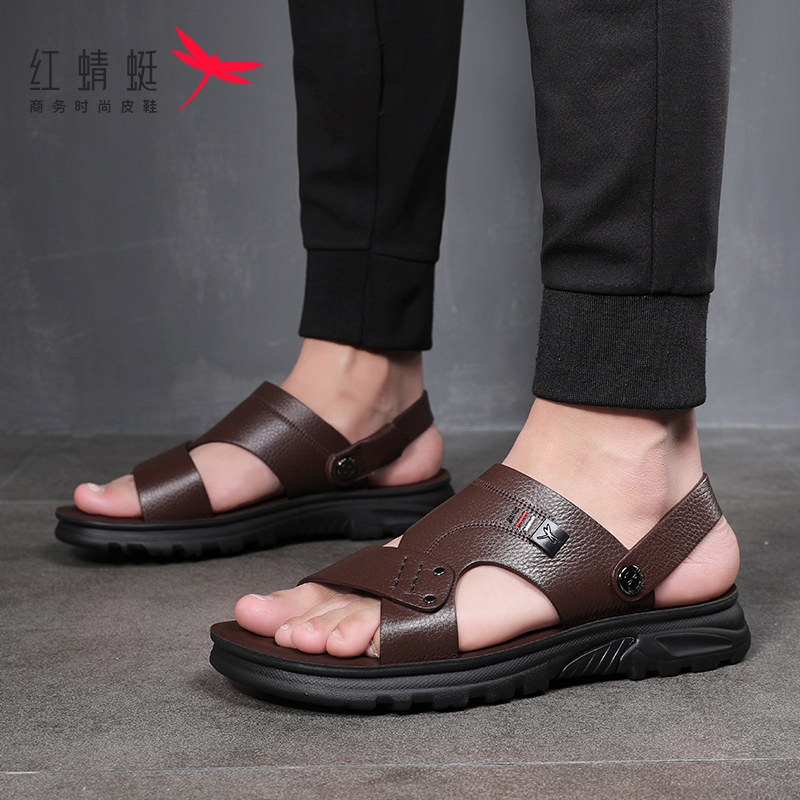 Red Dragonfly Summer New Leather Sandals Men's Leather Pure Cow Leather Dad Driving Cool Slippers Brands Outside Wearing Beach Shoes-Taobao