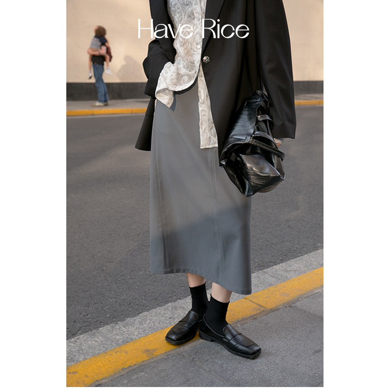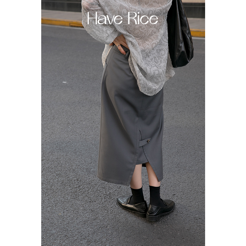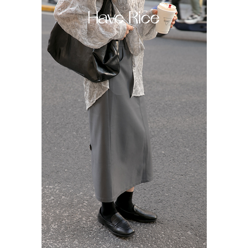 HAVERICE restaurant explosive high-waisted A-line gray slim straight mid-length skirt design sense skirt autumn