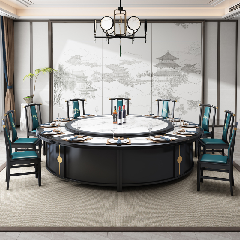 Hotel electric dining table 20 people solid wood slate large round table new Chinese style hotel box club commercial hot pot table and chairs