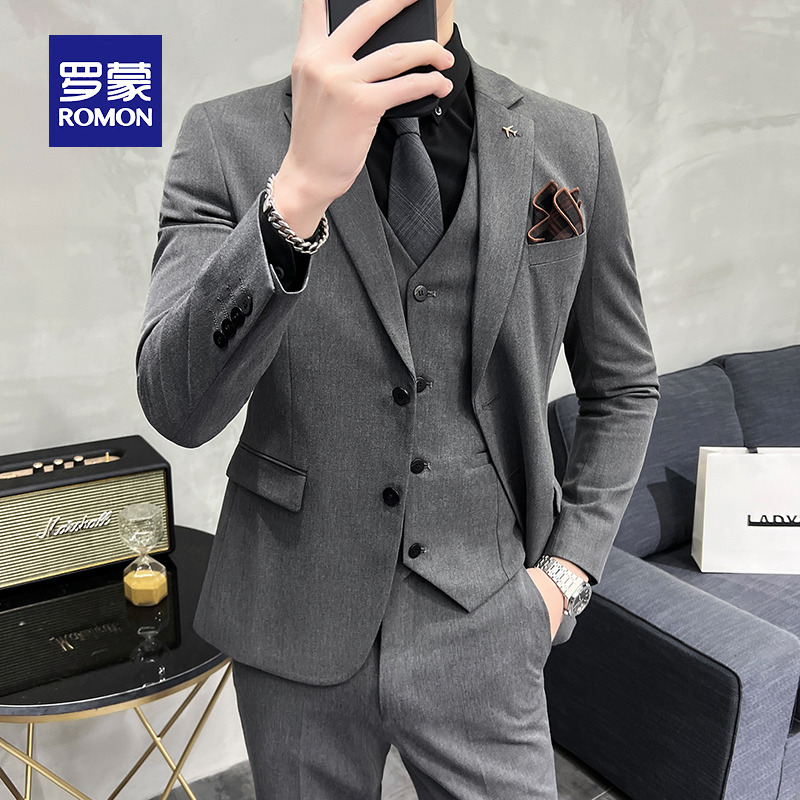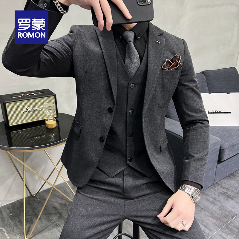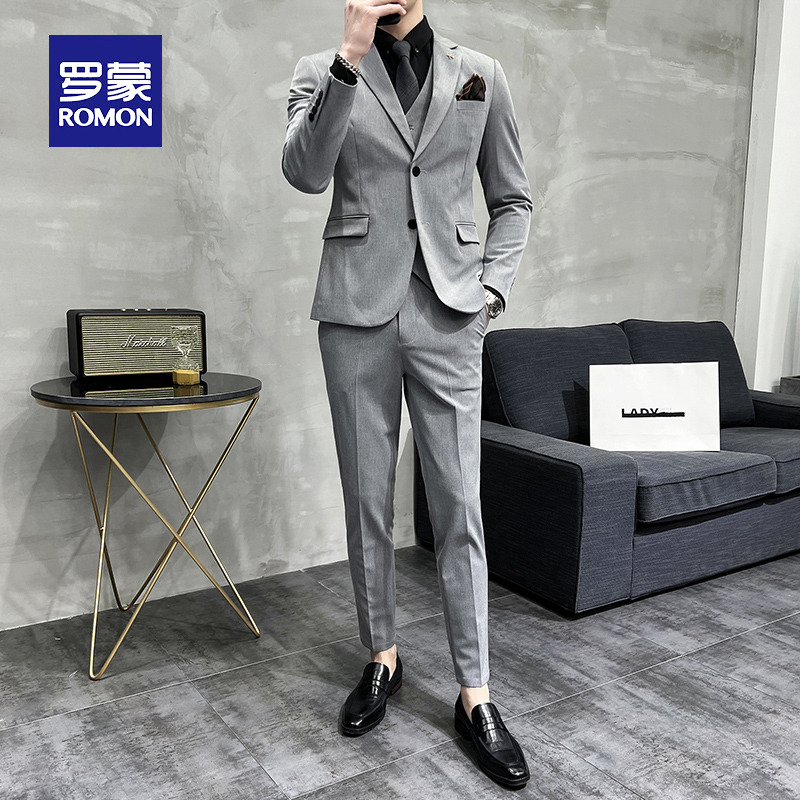 Romon Solid Color Suit Suit Men's Korean Slim Business Casual Workwear Suit Groom Wedding Dress Formal Dress