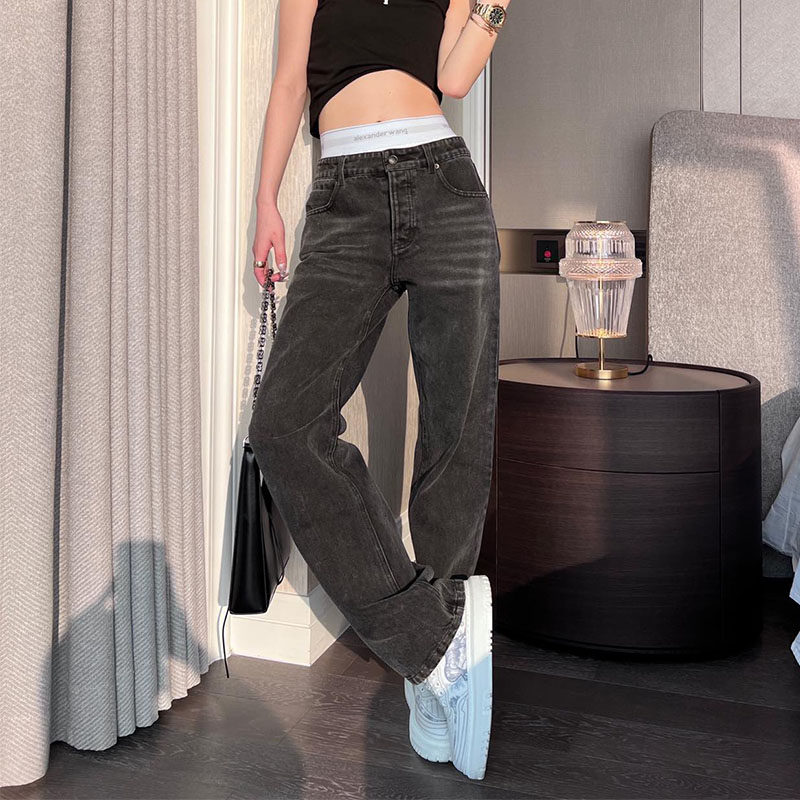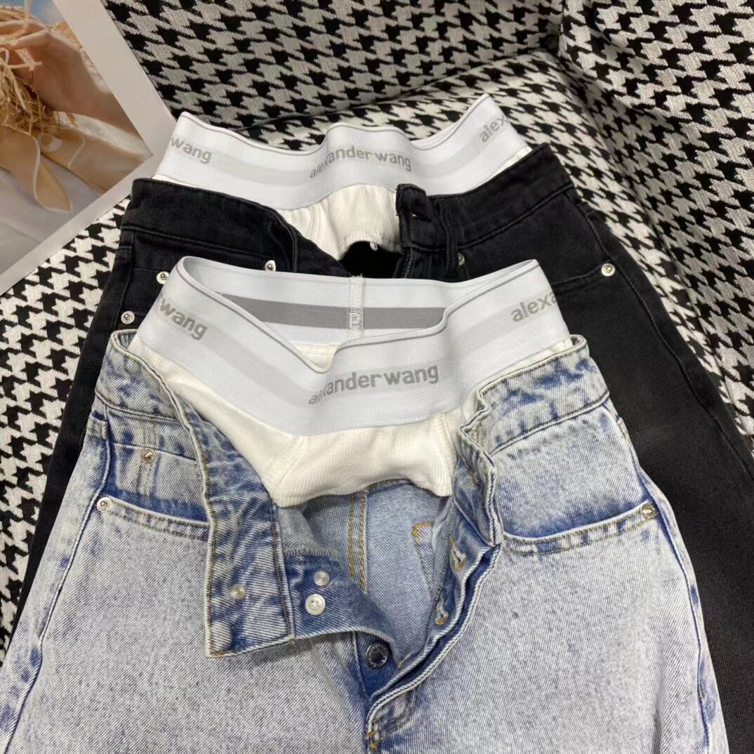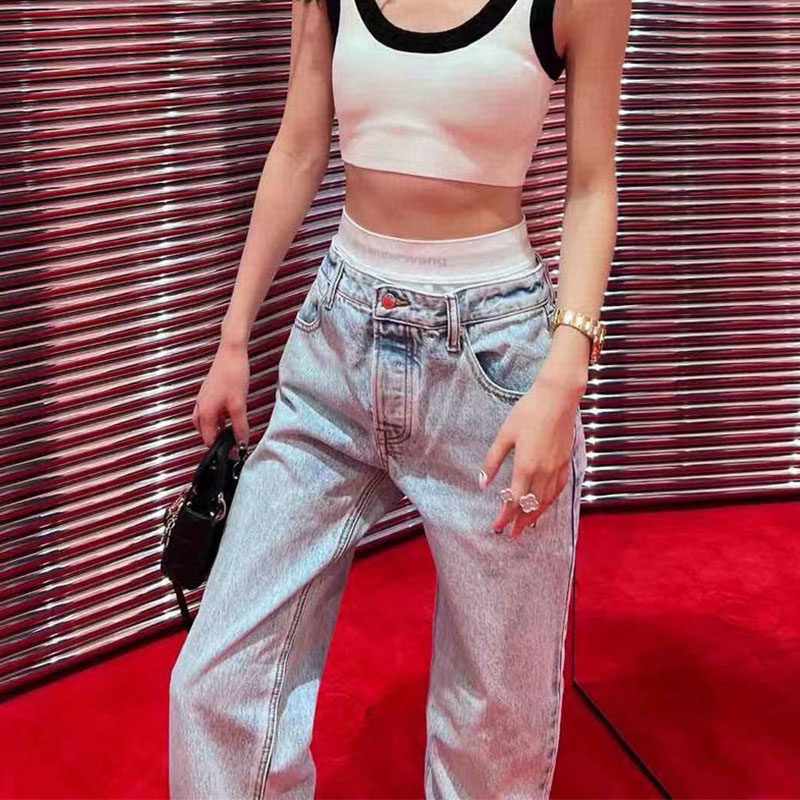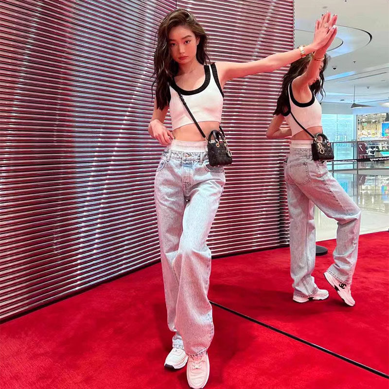 Double Waisted Jeans Woman 2022 Spring Summer New splicing Collision Color Fake two wide leg pants Slim Loose Straight Barrel Pants