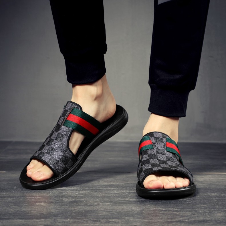Cool Shoes Men's Summer Trends Outside Wearing Net Red Plaid Head Layer Bull Leather Lined With Casual Slippers Male Non-slip Deodorant