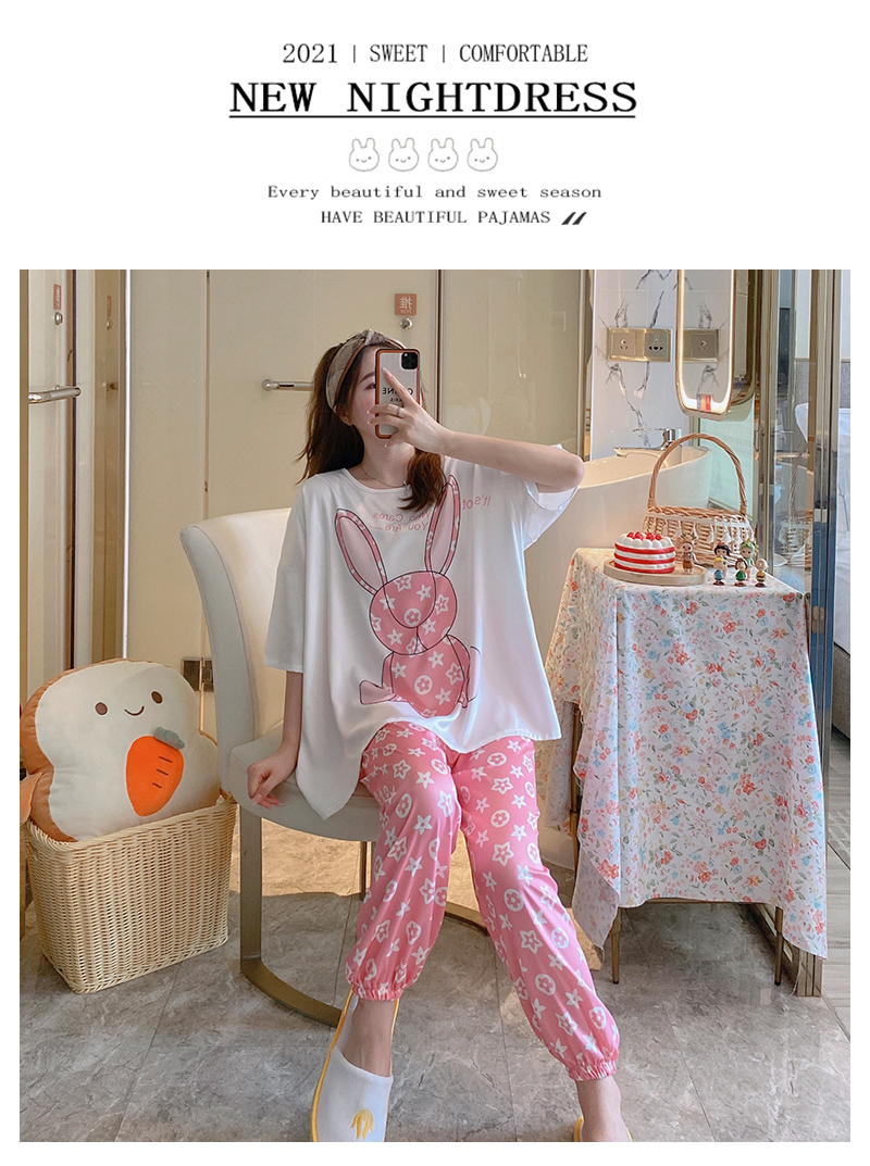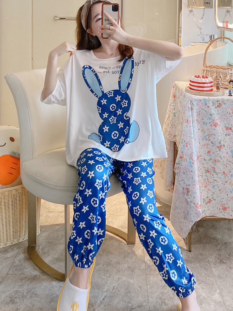 Blue Pyjamas Women Summer Short Sleeves Shorts Pants Three suits Spring and autumn money Cartoon Home Clothing Can Go Out Thin