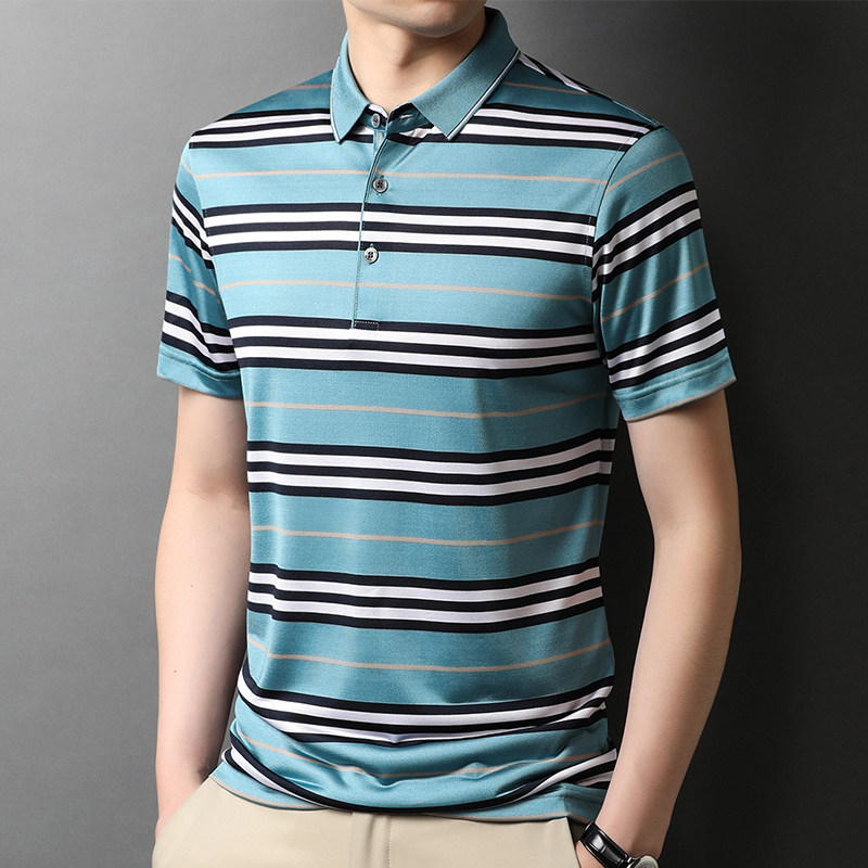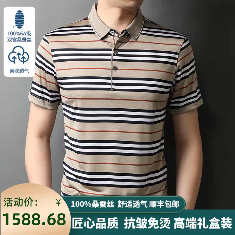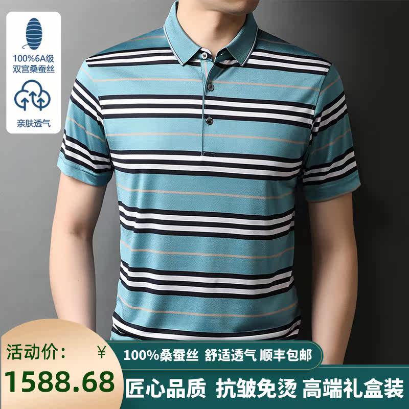 Ordos production 100 mulberry silk striped short sleeve T-shirt male summer middle age loose business ice silk cool T-shirt