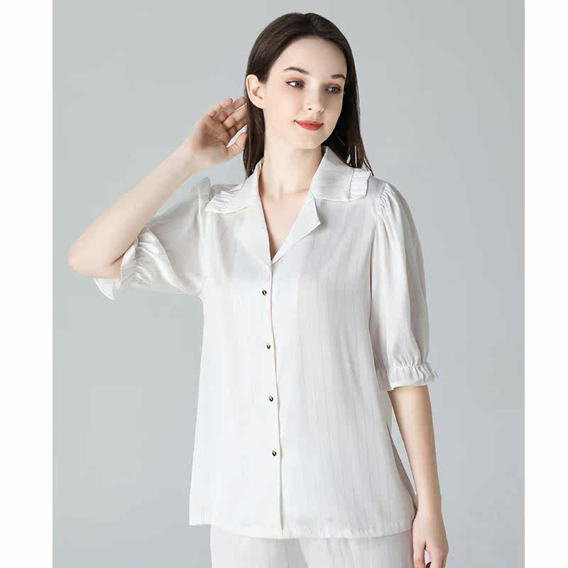 Rice White Wave Collar Short Sleeve Long Pants Woman Suit