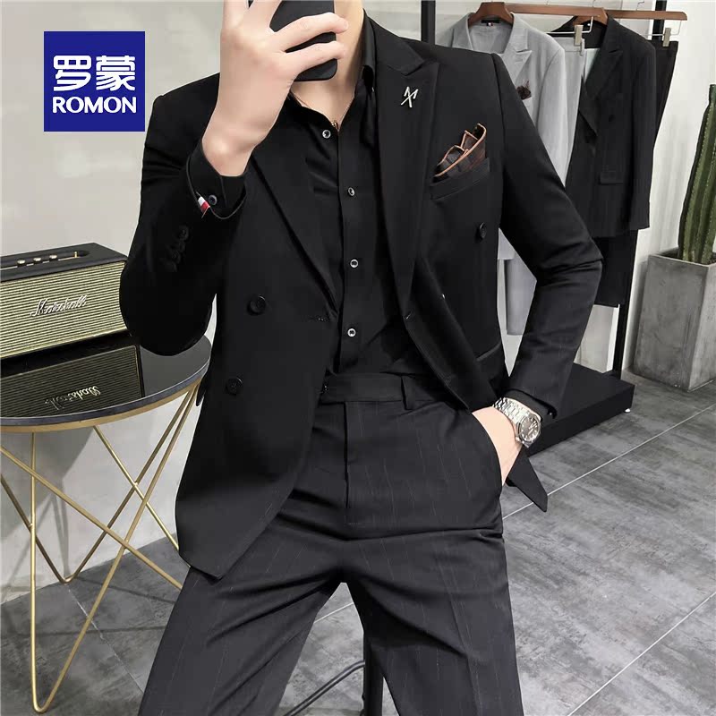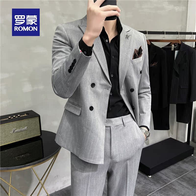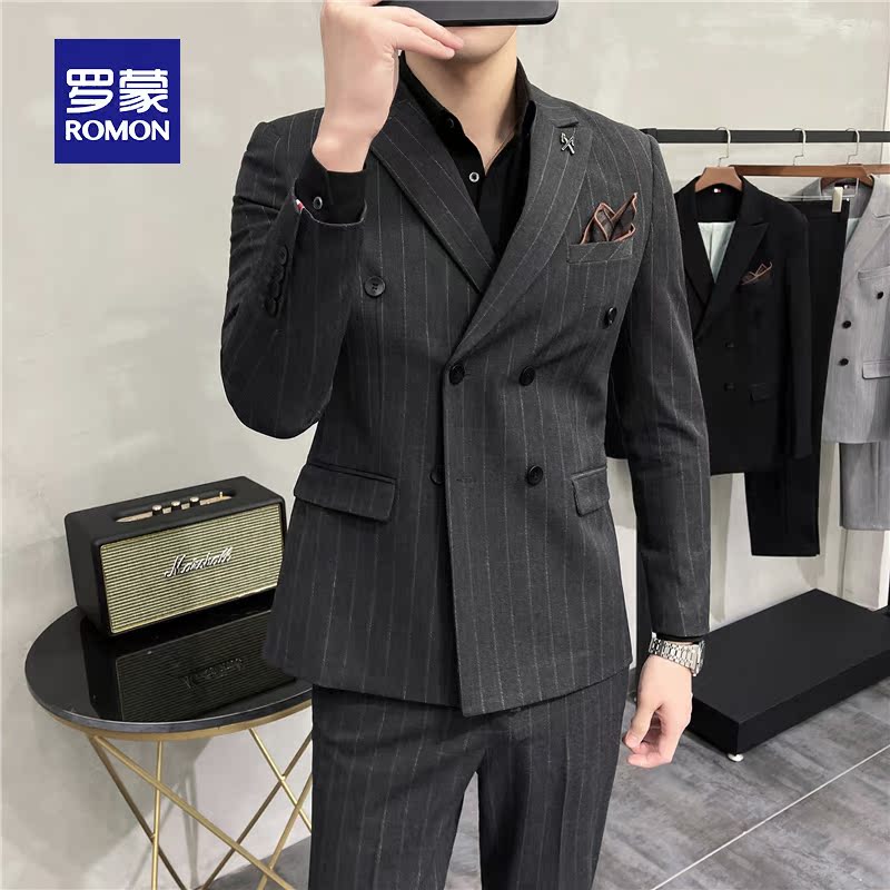 Romon groom wedding striped dark grid suit suit men's double-breasted slim business casual work suit suit