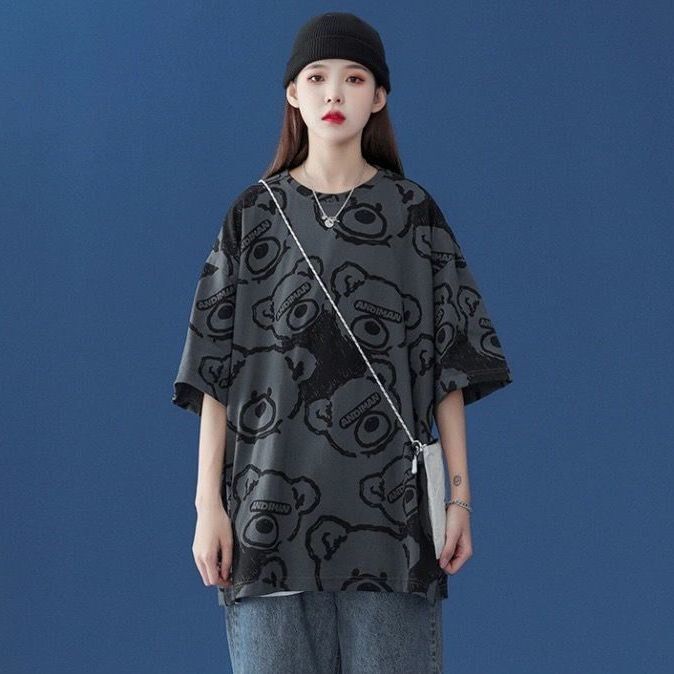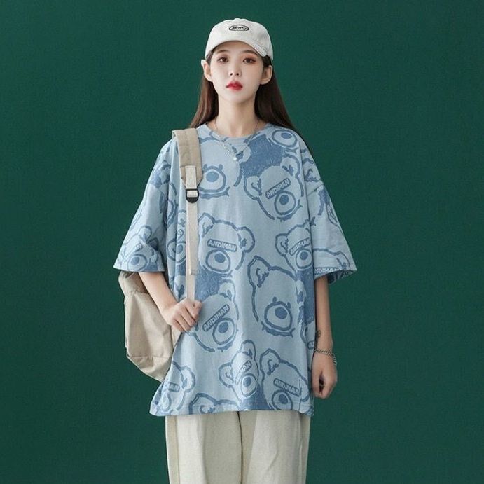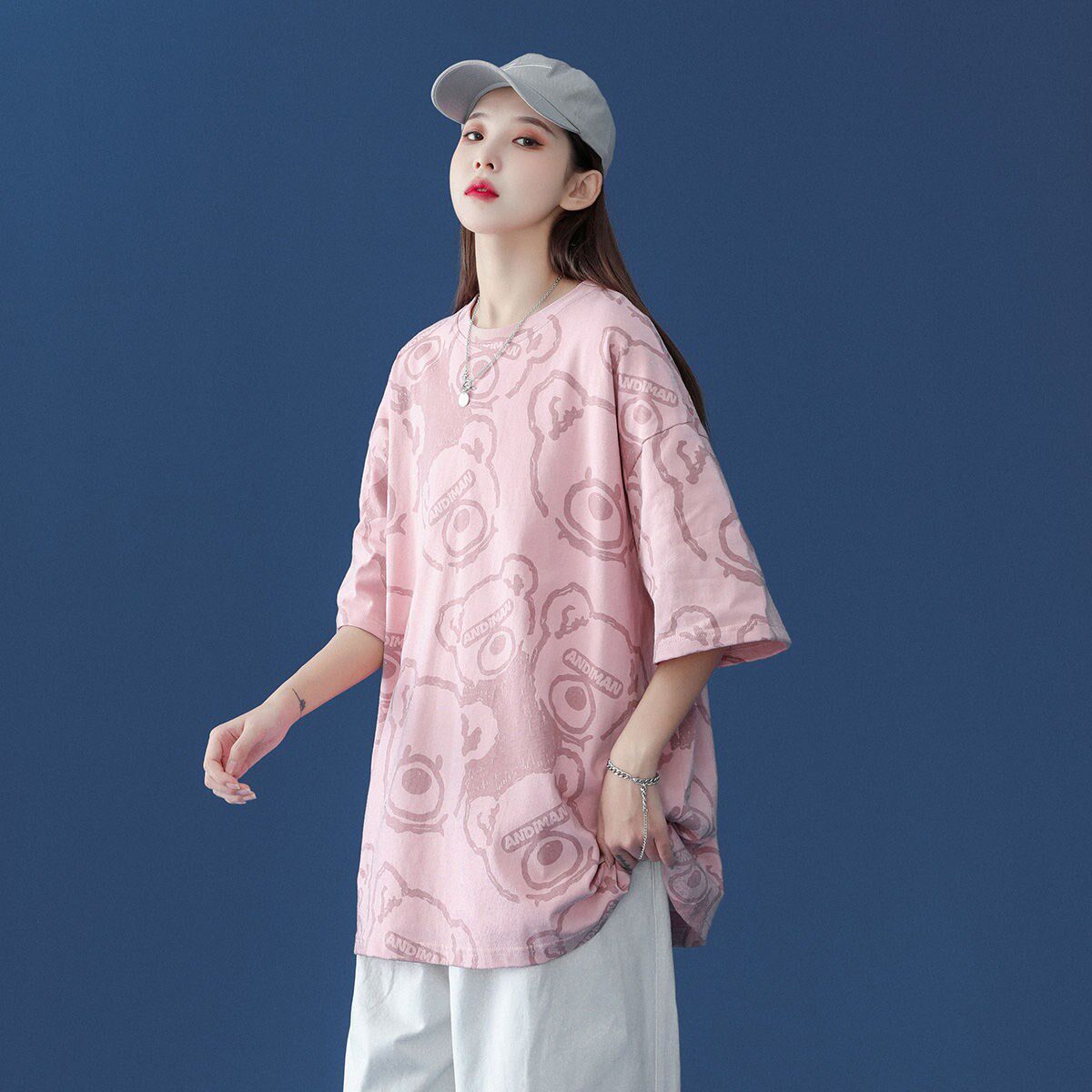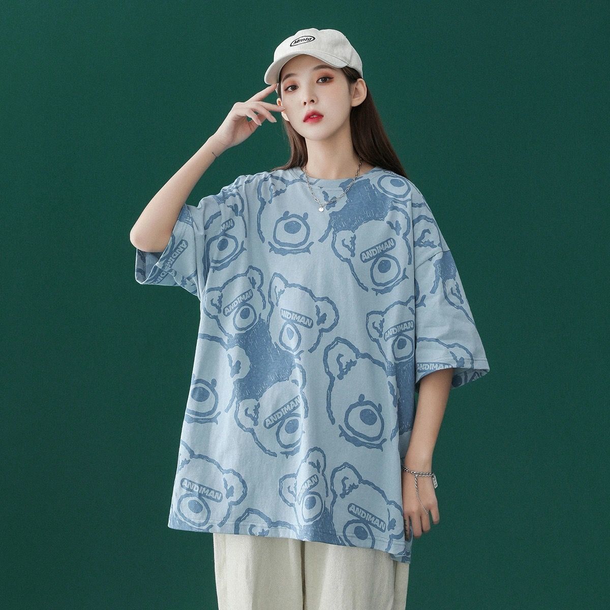 Summer new bear full print short-sleeved t-shirt female students 2022 Korean version loose BF Harajuku Hong Kong style all-match tops