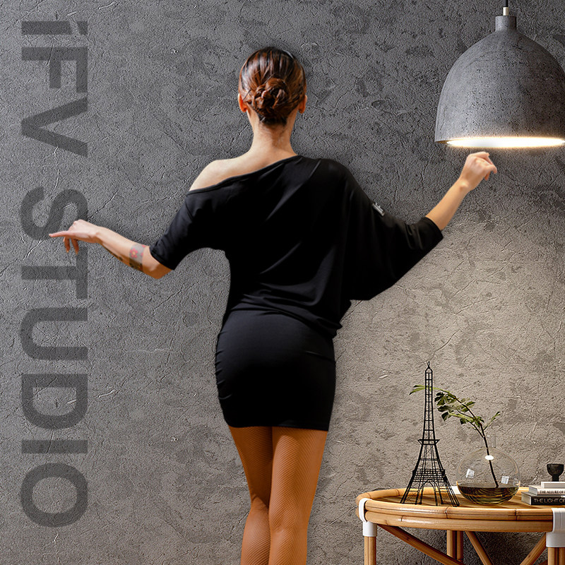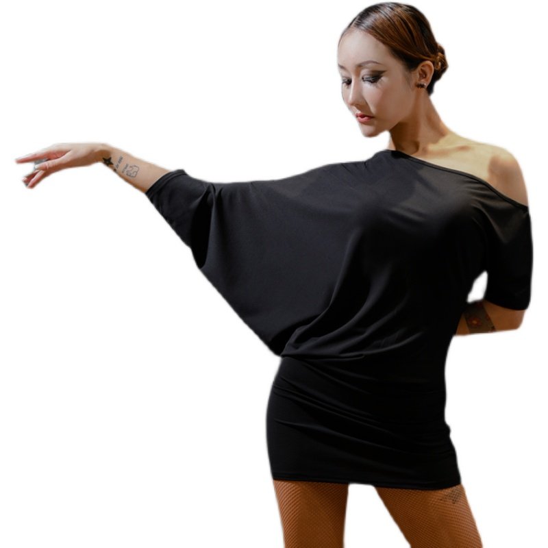 IFV Latin dance clothes adult women's summer mid-sleeve practice clothes dress slanted shoulder bat sleeve short skirt is tall and thin