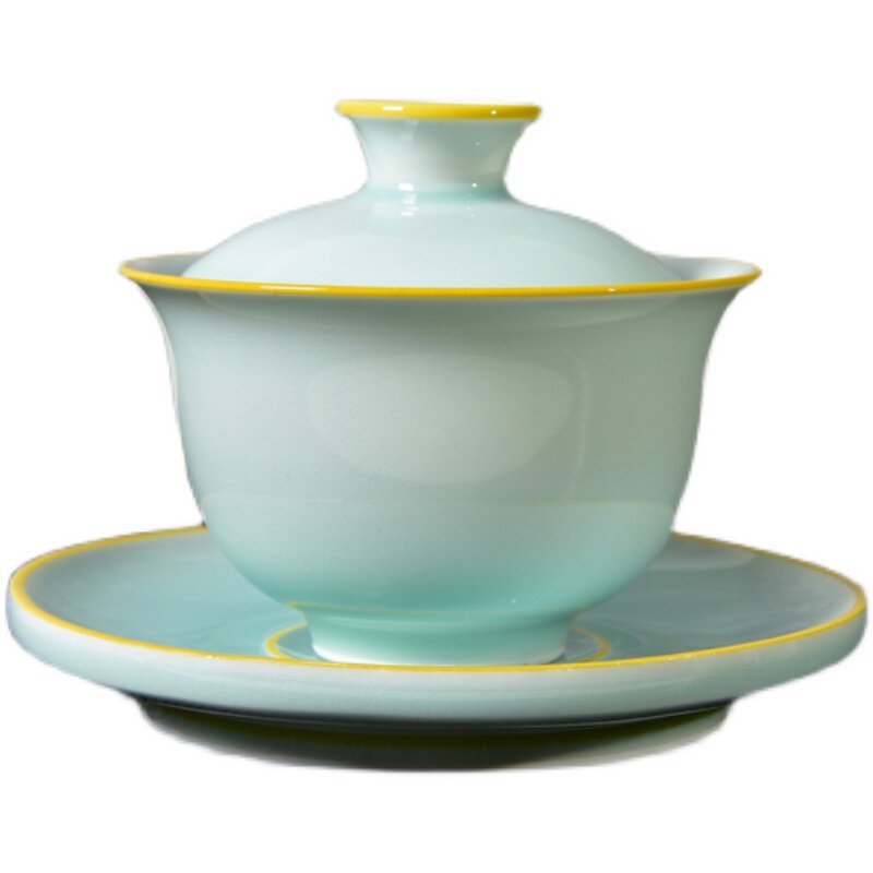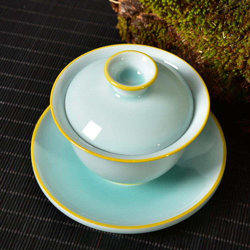 Longquan celadon high-end handmade three-cai bowl ceramic kung fu tea set Zheng Xudong red edge large tea bowl underglaze stroke