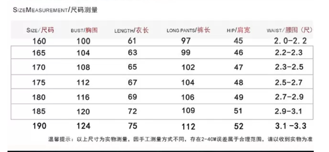 S 160 (suitable for around 85-105 catty) M 165 (suitable for around 105-115 catty) L 170 (suitable for around 115 -125 catty) XL 1