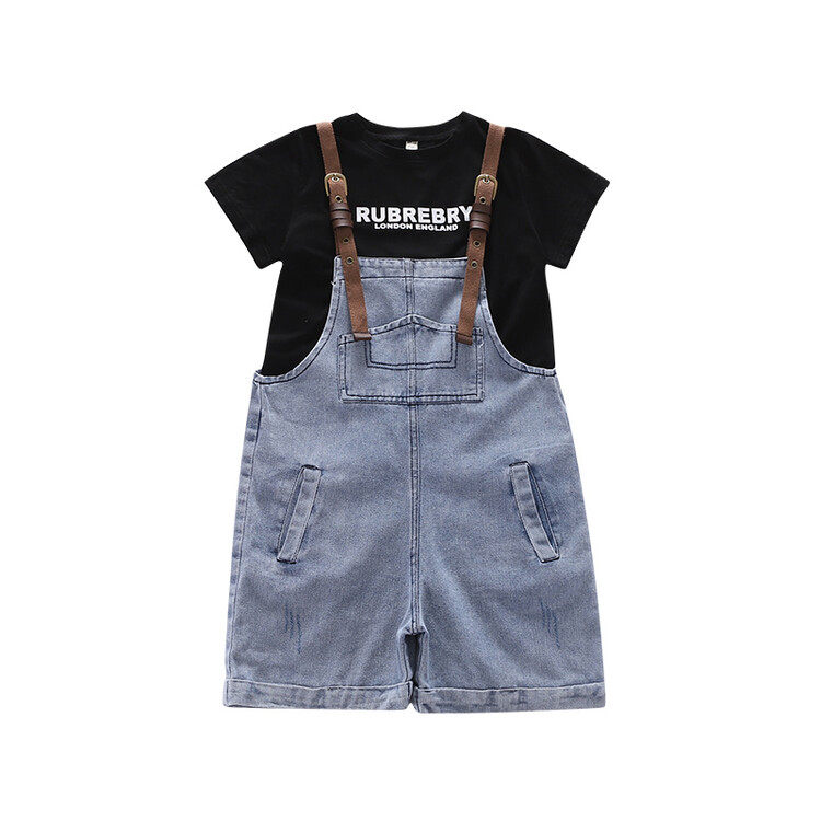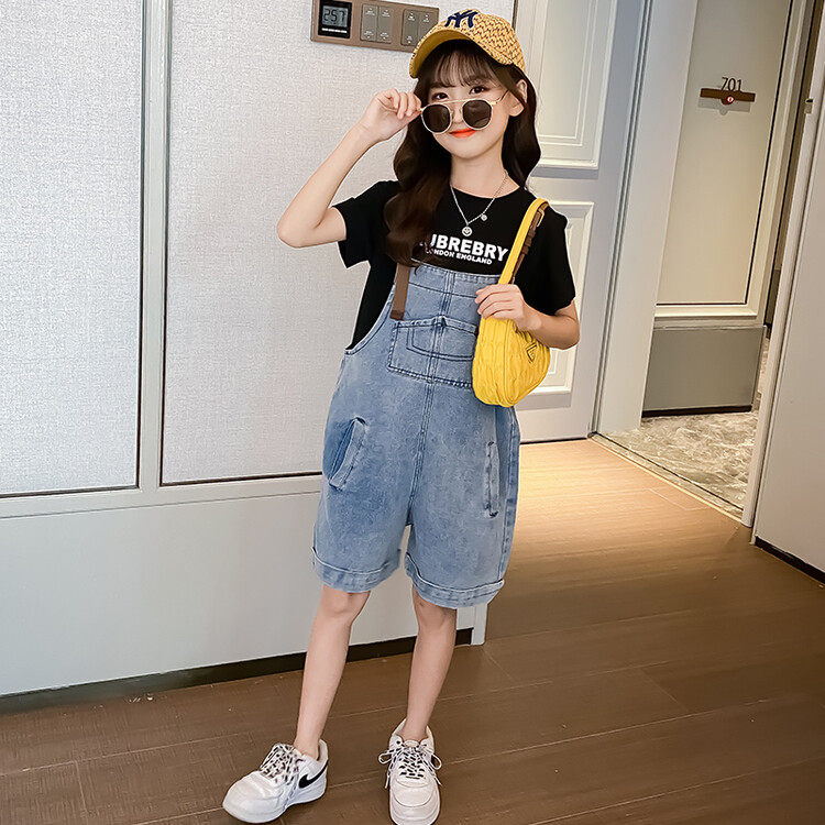 Girls denim holding baby bag pants suit children's suit 2022 new medium and large children's shorts Western style pants summer two-piece