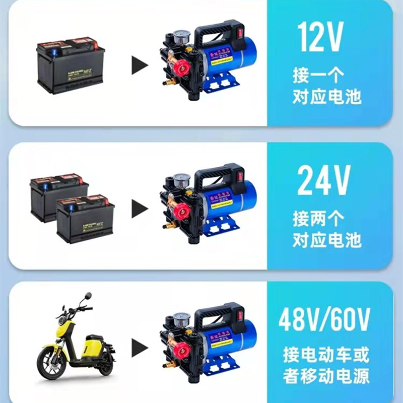 12V plunger pump (requires self-provided battery) 24V plunger pump (requires self-provided battery) 48V plunger pump (plug in battery car) 60V plunger pump (plug in battery car) 72V plunger pump (plug in battery