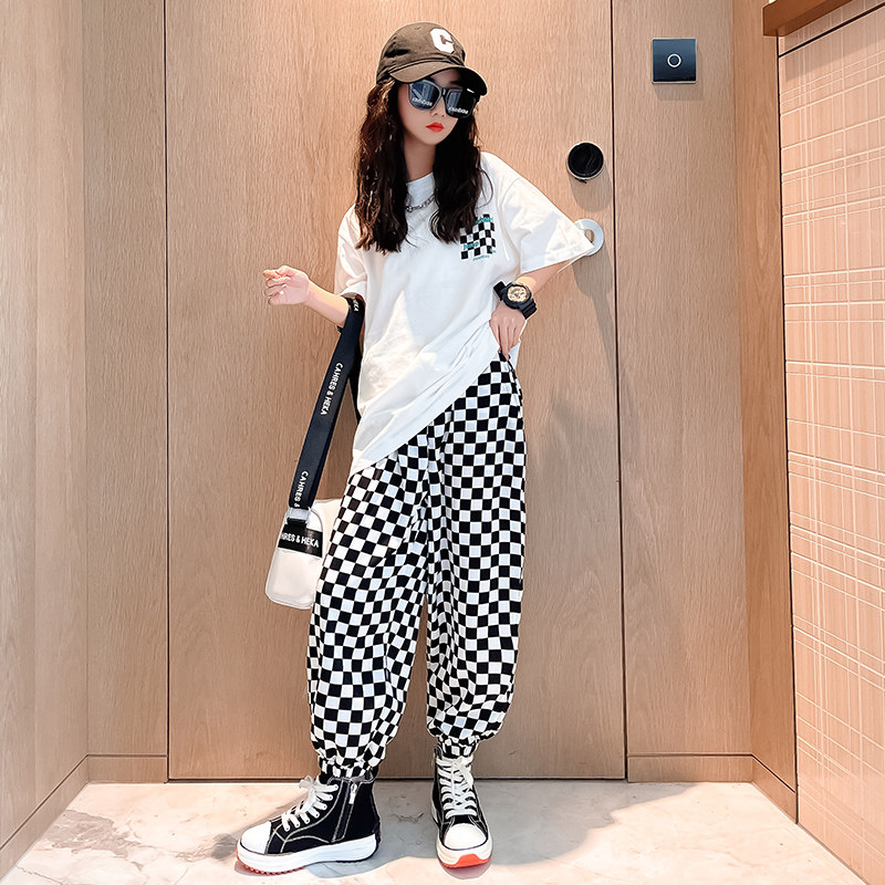 Children's Clothing Chessboard Lattice Suit Foreign Pie 2022 New Internet Red Children Short Sleeve Mosquito-Proof Pants Girl Thin two sets of damp