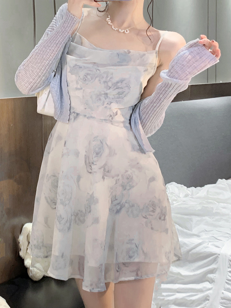 2022 new spring advanced sensational style first love snow spinning small sub-broken flower harnesses two-style foreign dress women's summer