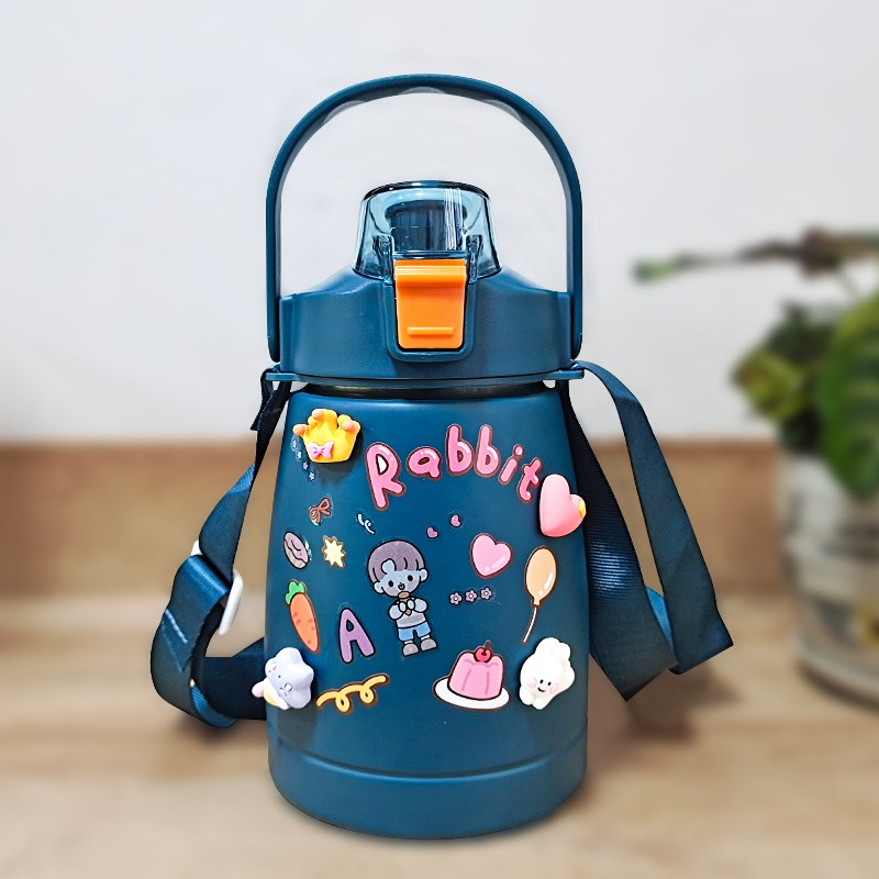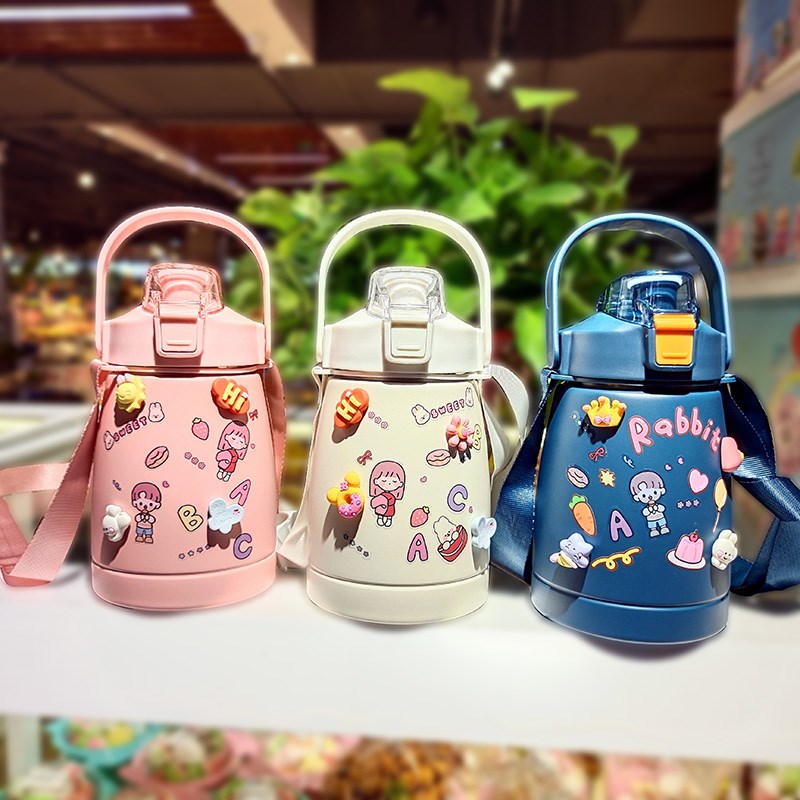 (Baby Bag Model) 1000ml Insulation Pot Belly Cup (Random Cartoon Stickers 3D Stereo Stickers 4 Capsules Straw Warm Pot Belly Cup (Light Blue) Distribution Random Cartoon Pot Belly Cup (Dark Blue) with