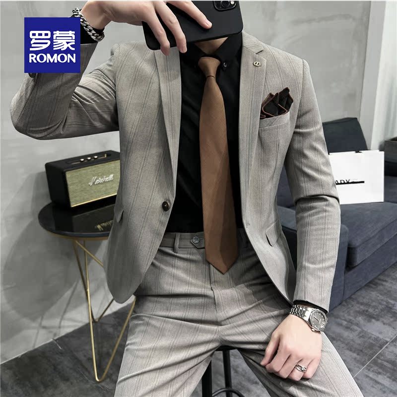 Romon 2022 spring and autumn striped suit suit men's Korean version of the slim business casual suit formal wedding dress