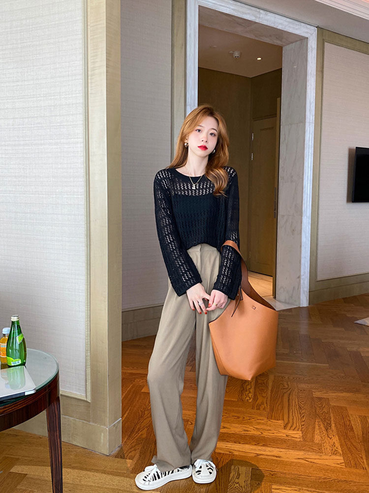 Hollowed-out knitted sweatshirt female spring new 2022 loot conspiculess wearing sweater thin and undershirt with long sleeve blouses