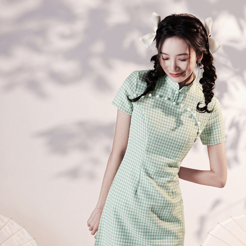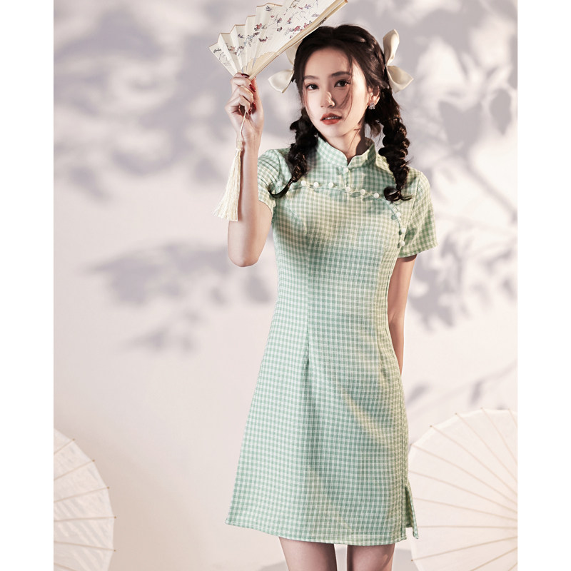 Green plaid improved cheongsam Republic of China small 2022 new small fresh sweet young girl summer