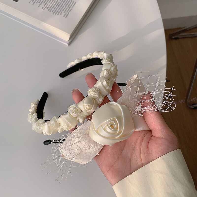 Three-dimensional white rose headband