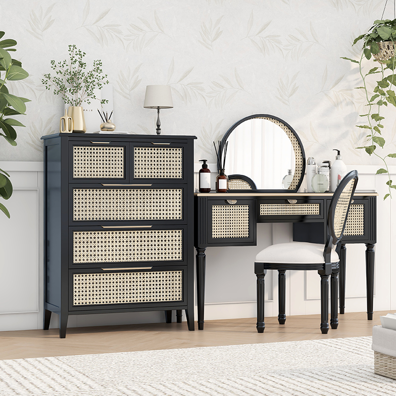 French retro bedside table rattan net red ins American light luxury medieval storage cabinet Nordic black solid wood side cabinet