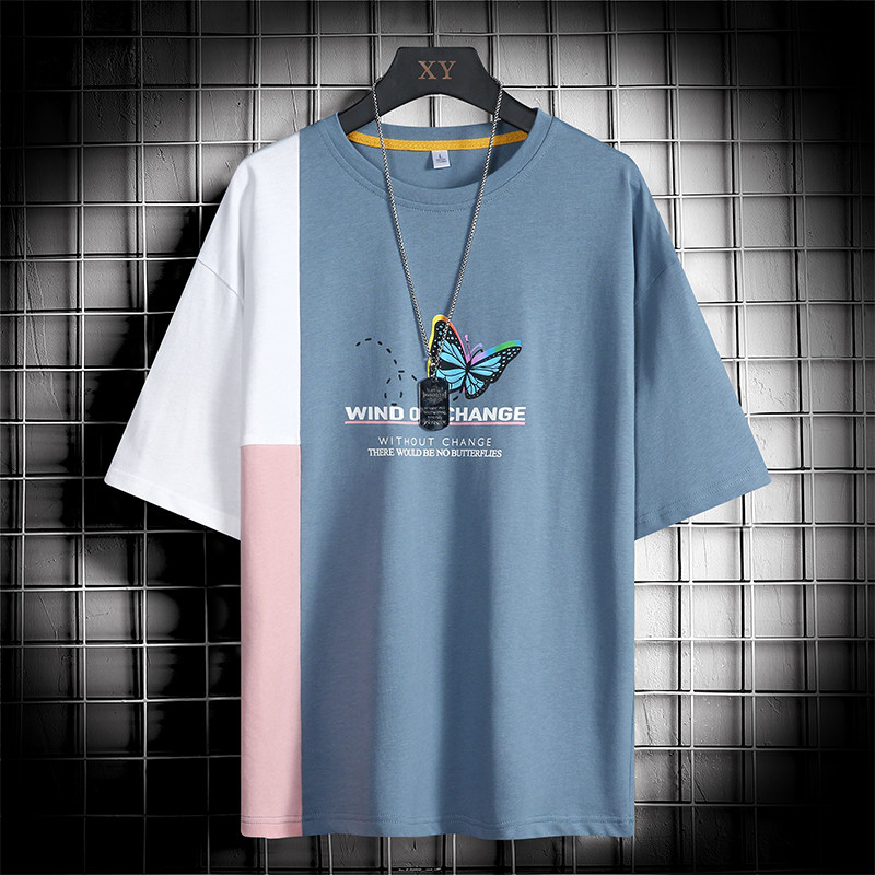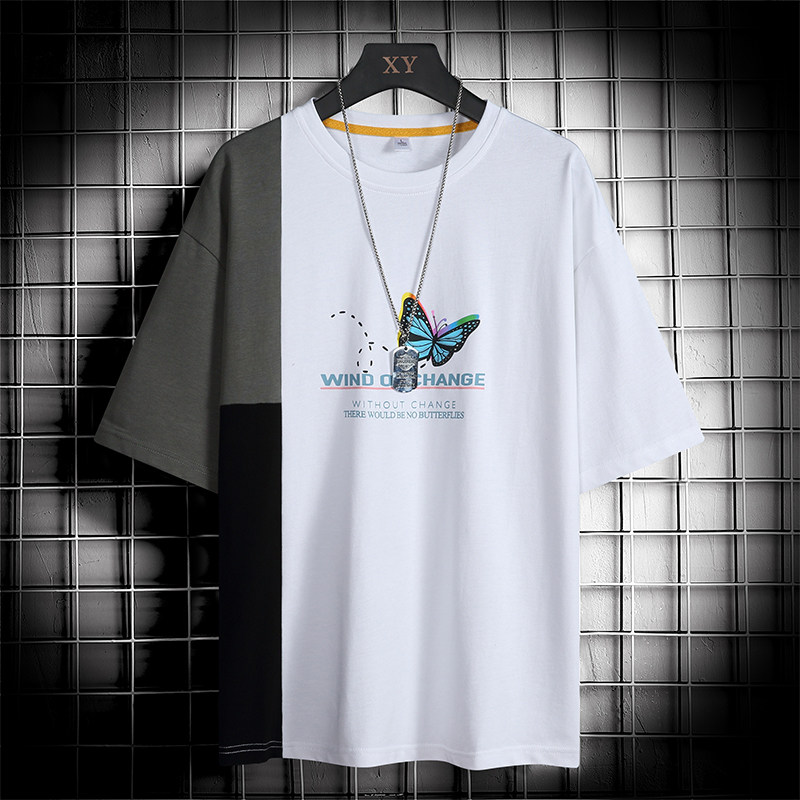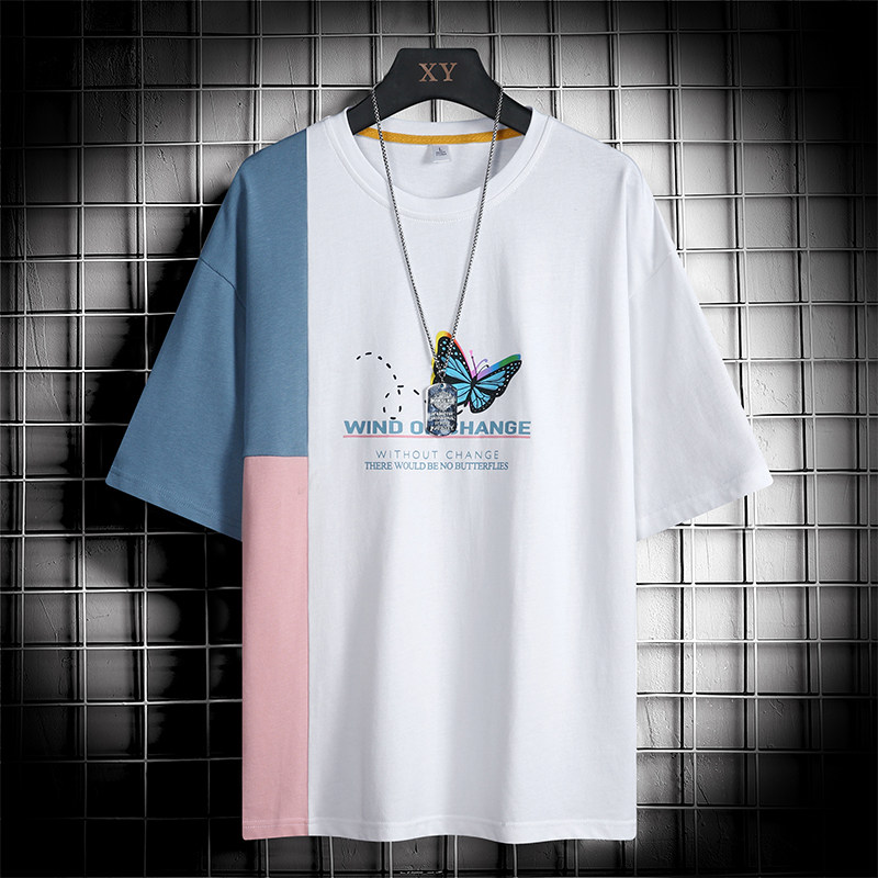 Men's short sleeves T-shirt on the bottom shirt Ins trend Chains Tide Cards Teenagers 100 hitch Collision Color Splicing Easy half sleeves