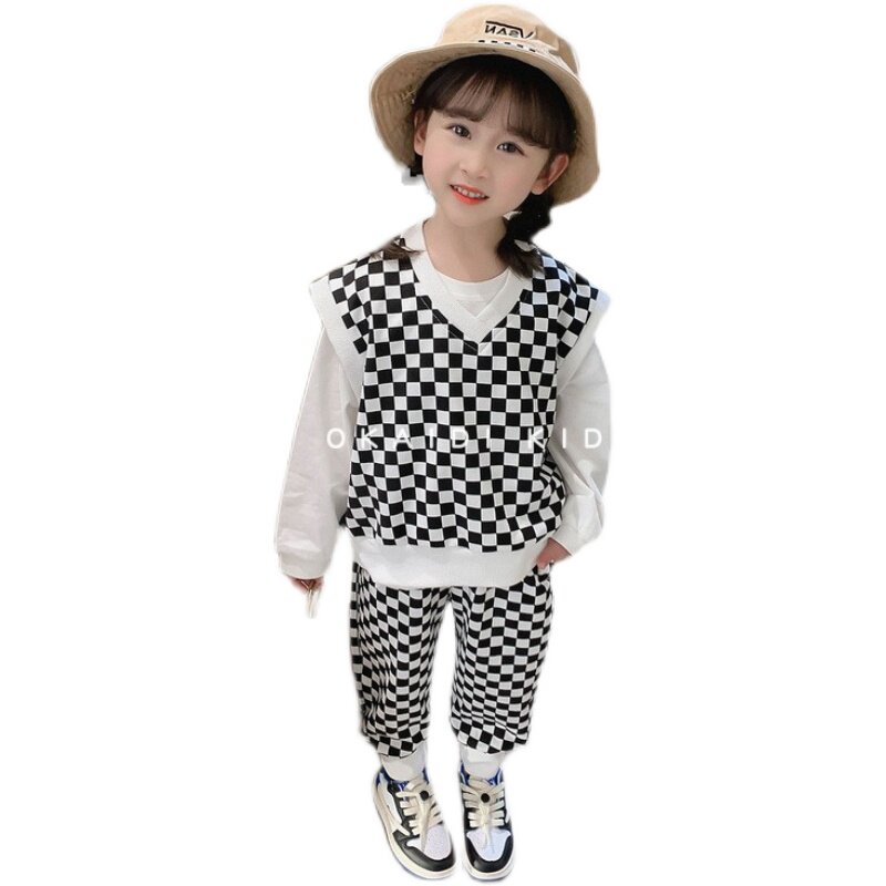 OKAIDI French children's new spring clothes Western style sweater suit girls spring and autumn checkerboard vest three-piece tide