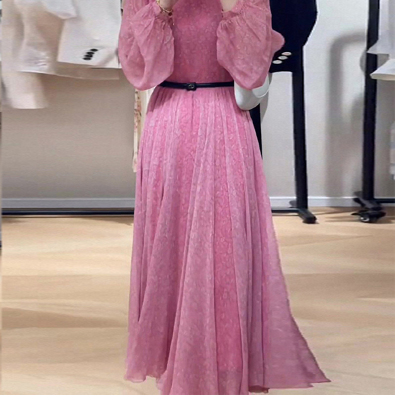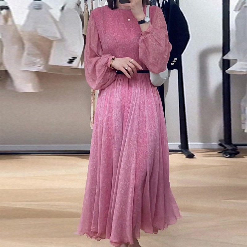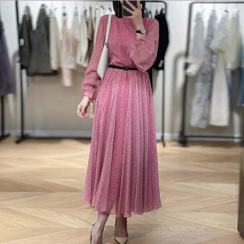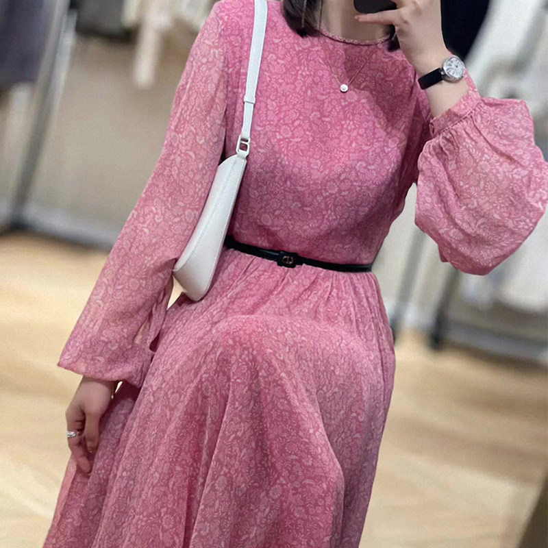 High-quality red floral French long-sleeved retro dress 2022 early autumn new women's waist skirt texture