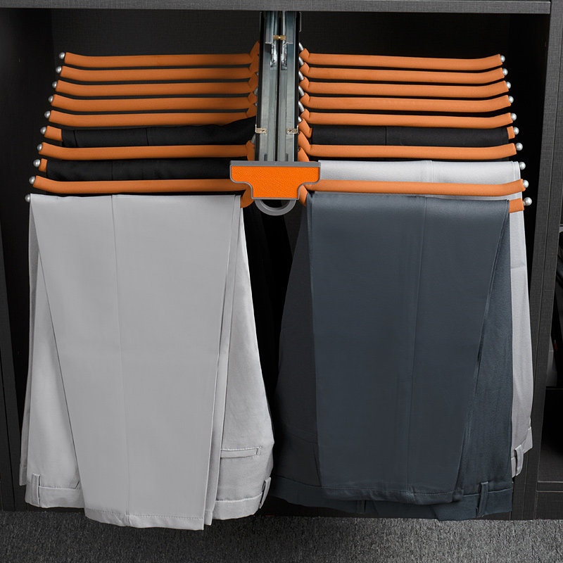 -Orange-top-fitted pair of trousers rack-orange-top-mounted single-lined trousers rack-orange-right fit trousers rack-grey-top-mounted double-lined trousers rack-grey-top-fit