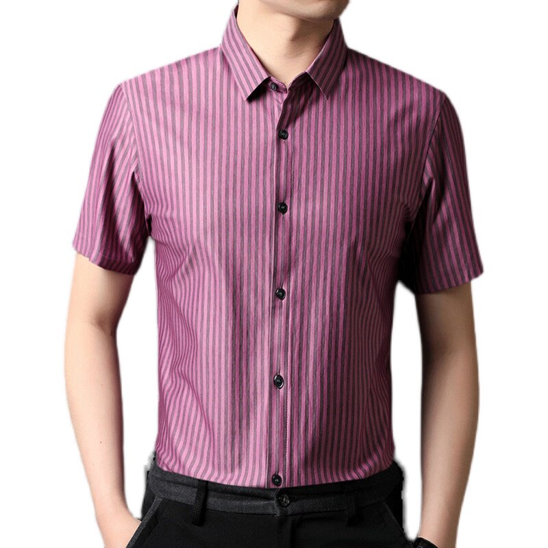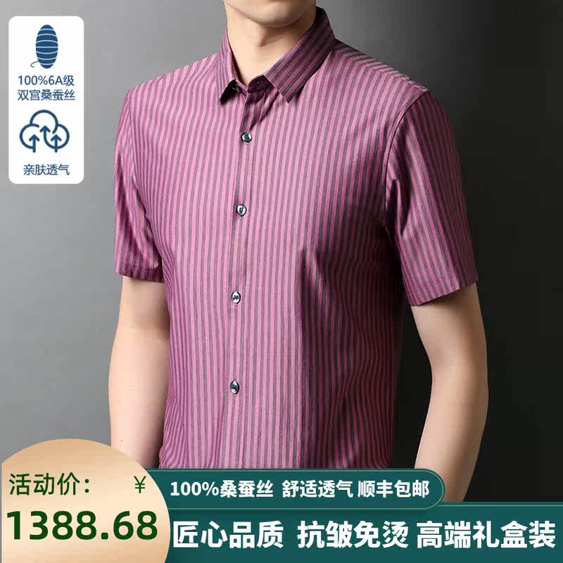 Ordos prolific new upscale mulberry silk short sleeve shirt for men's summer middle weight real silk striped shirt