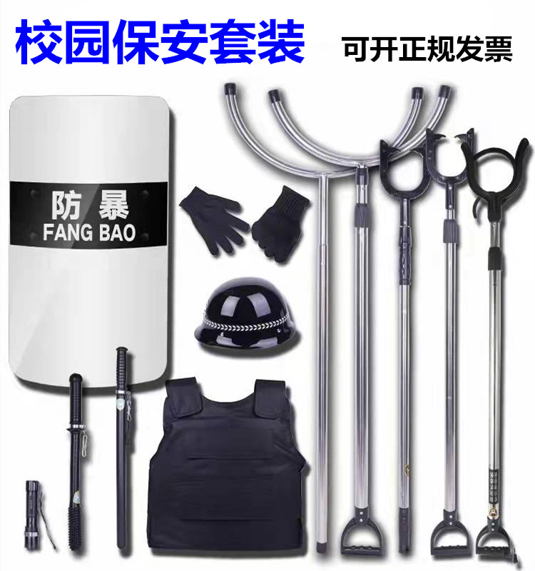 Anti-riot security eight-piece shield steel fork stab-proof vest metal flashlight security stick gloves campus security patrol
