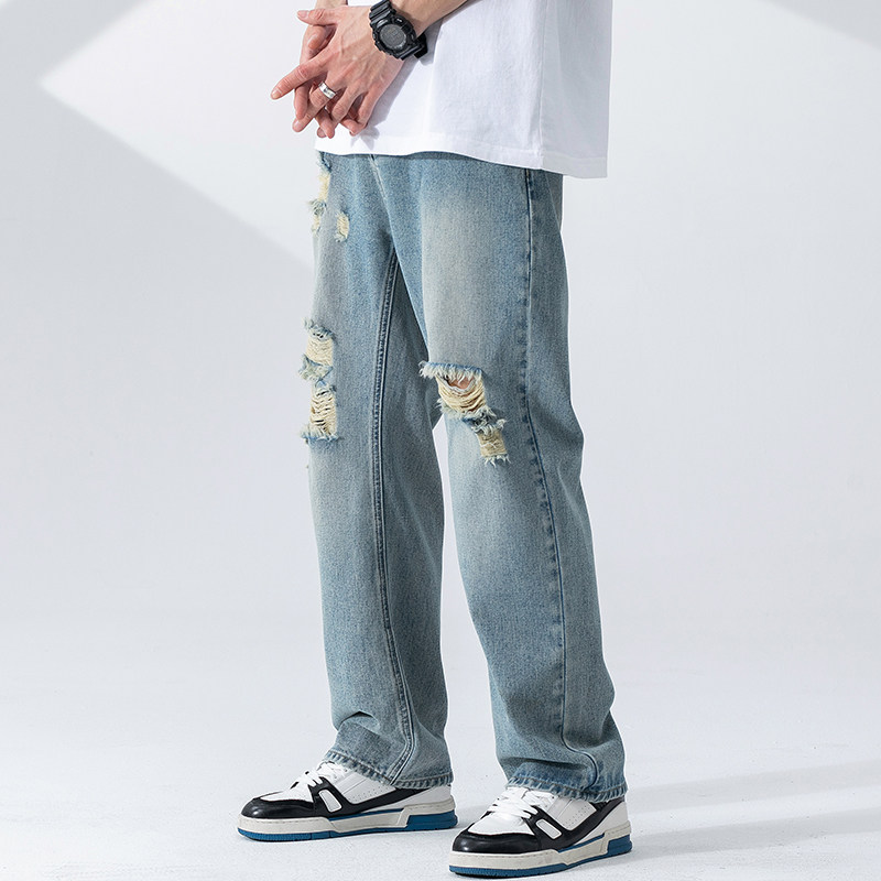 Summer new pendant feel loose with Hole Jeans Men American Retro French Fried Street Straight Silo Tug Wide Leg Long Pants