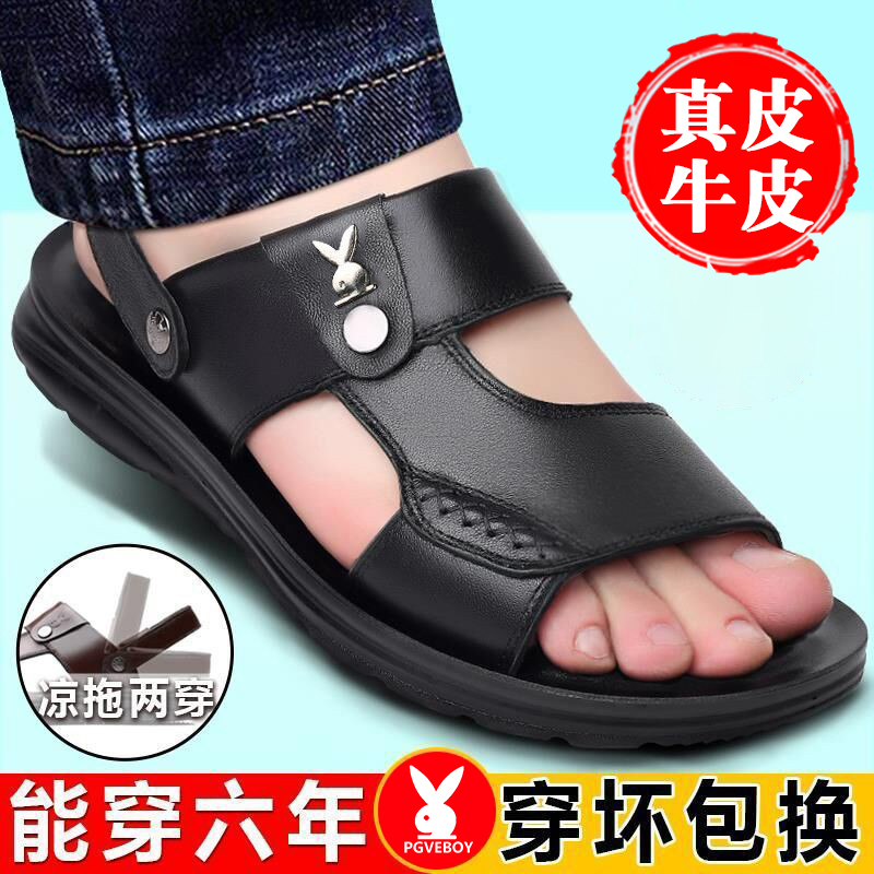 Sandals men's section 2023 Summer new genuine leather casual beach shoes Soft bottom non-slip double-use cool slippers Driving-Taobao
